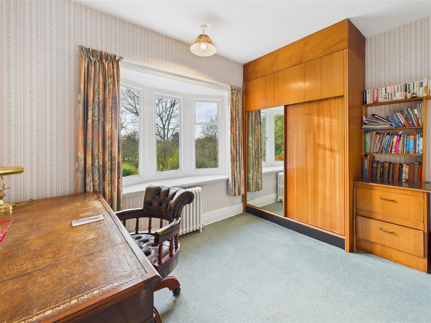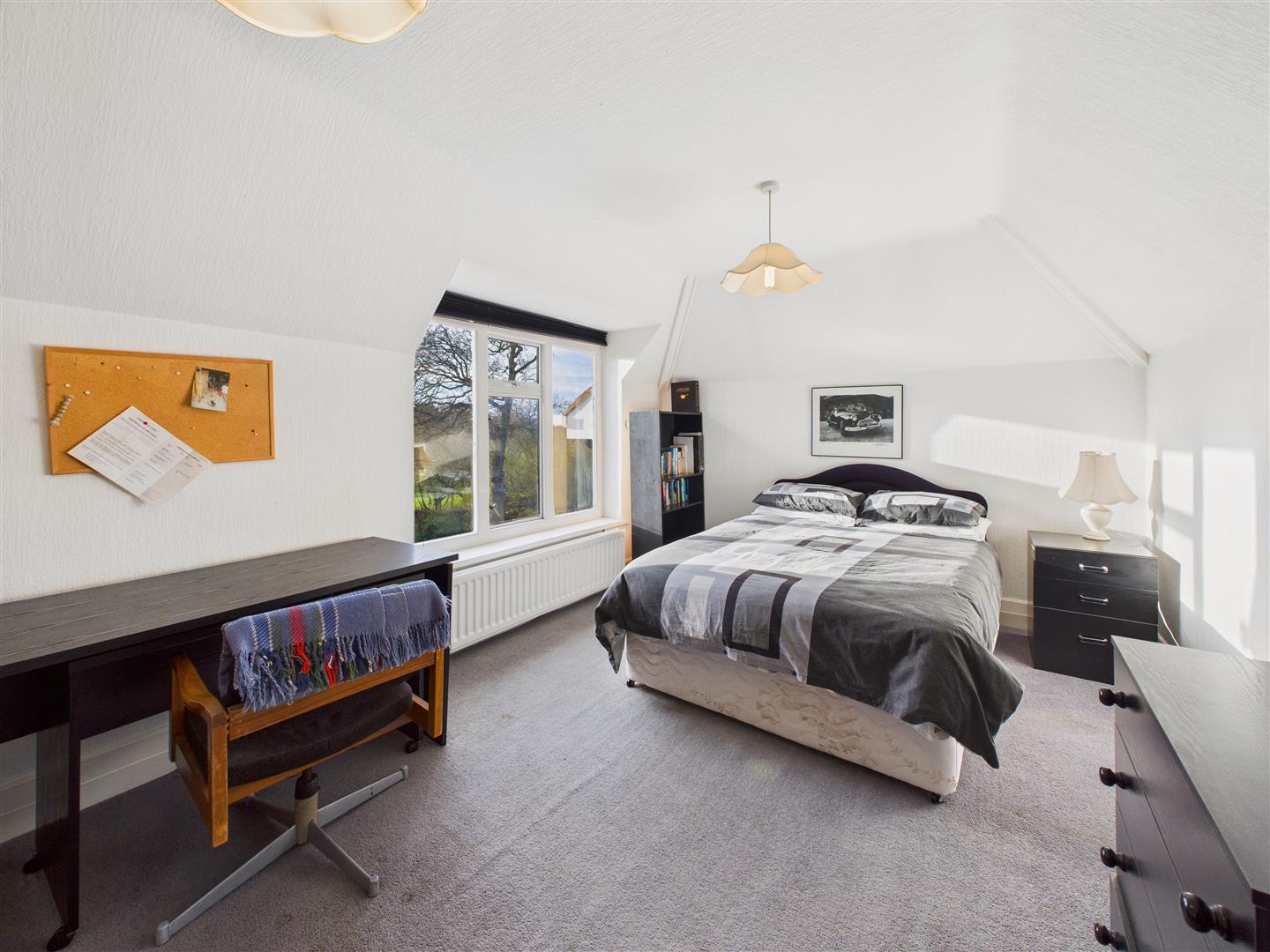 A spacious double bedroom, again with a stunning deep bay window to the south-west providing great views across the garden and beyond. Traditional fitted wardrobes and central dressing table with drawers to one wall.