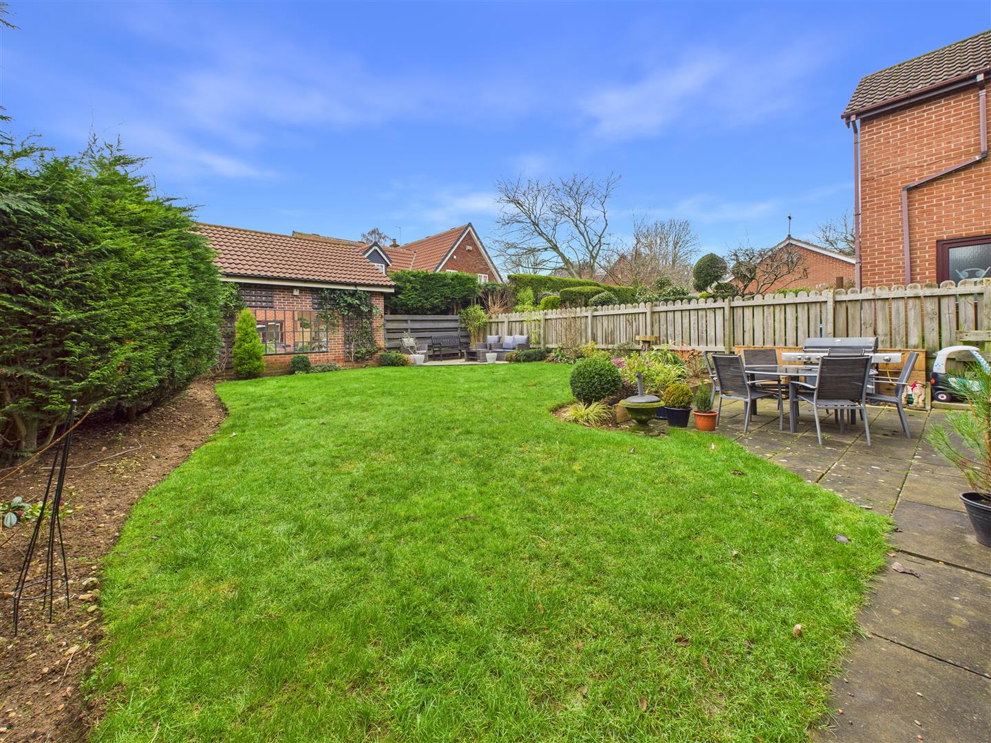 The front of the property features a lawned front garden and a driveway leading to a single integral garage. The westerly facing rear garden is a particular highlight, offering a mix of lawn, patio areas, and mature shrubs, making it an ideal space for enjoying the afternoon and evening sun.