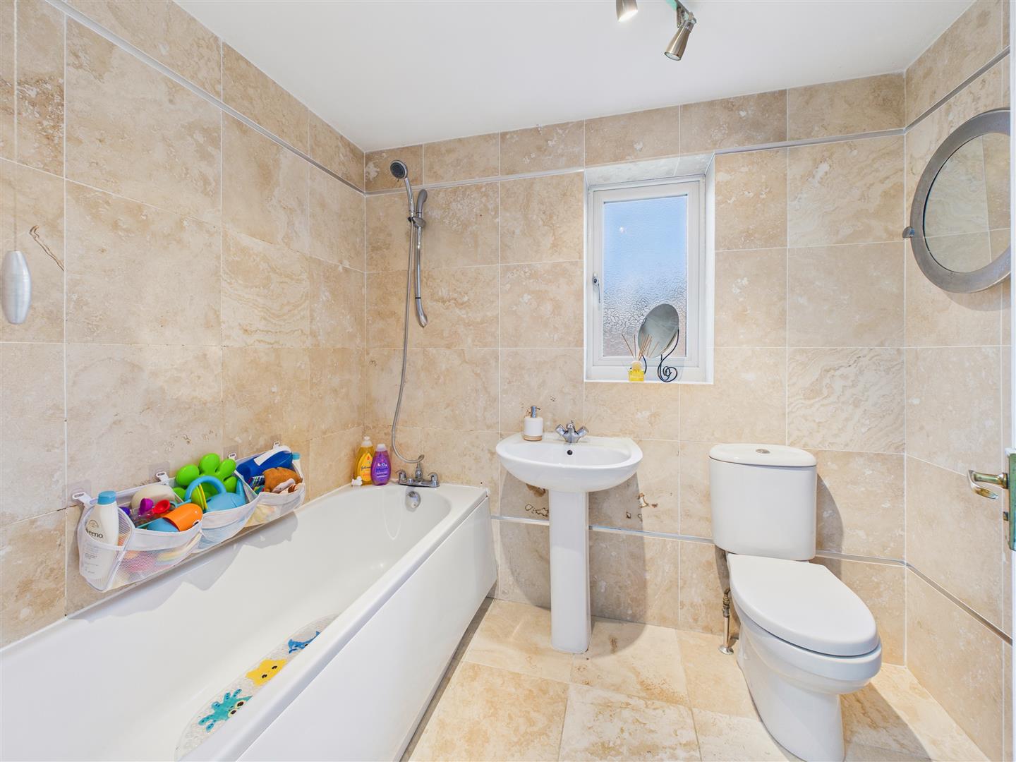 With suite comprising a bath with shower attachment, wash hand basin and low flush W.C. Heated twoel rail, tiling to walls and floor, window to rear.