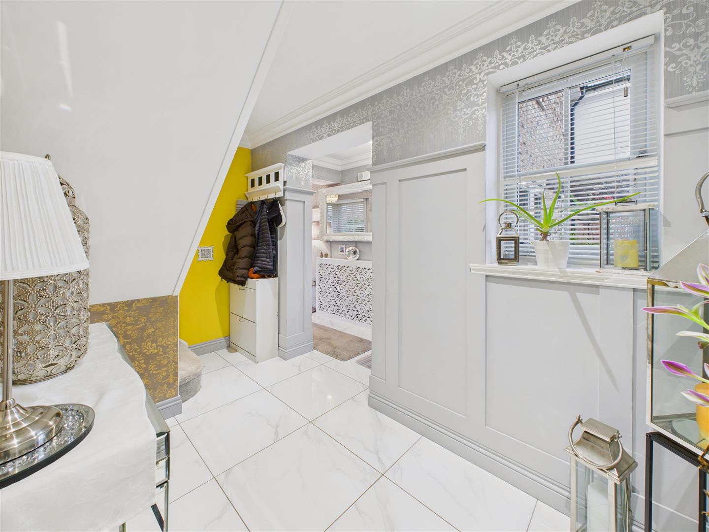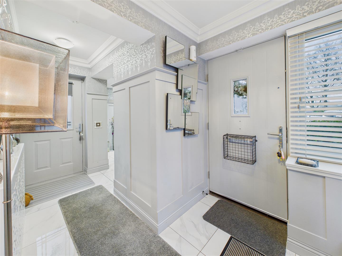 Spacious and welcoming with tiled floor and porch style bay windows and doors to both front and rear elevations.