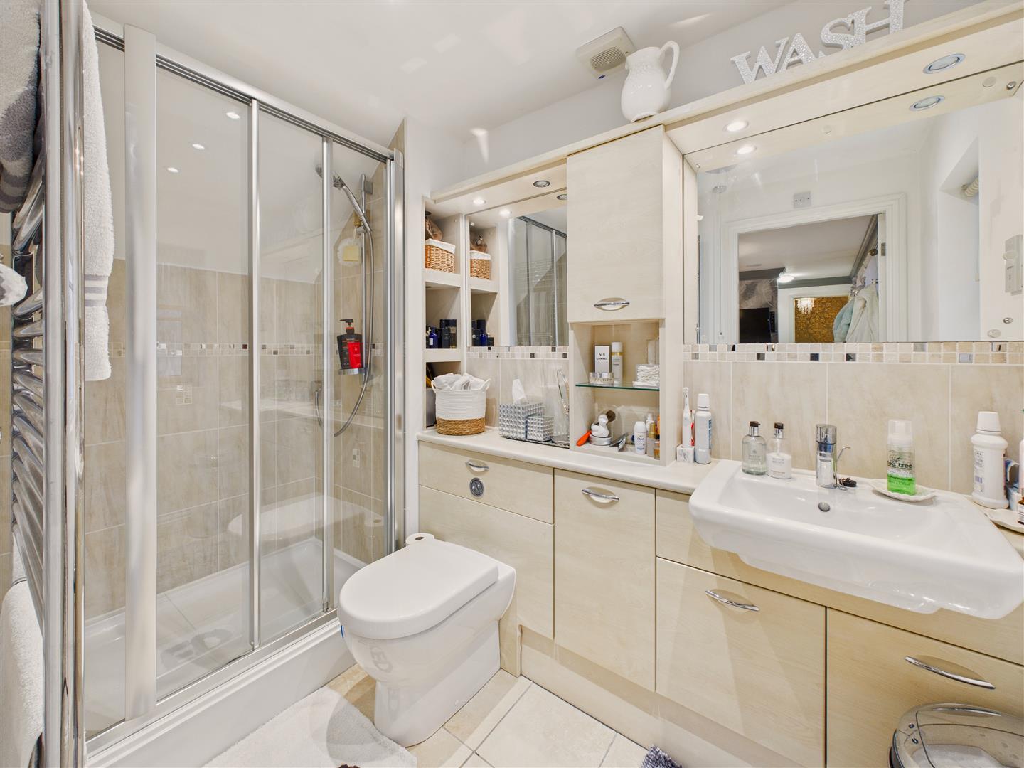 A luxurious en-suite shower room with a Villeroy and Boch sanitaryware including a concealed flush W.C, cabinet housing a wash hand basin and a large shower cubicle with Hansgrohe fittings. Tiled surround and tiling to the floor. Heated chrome towel rail.