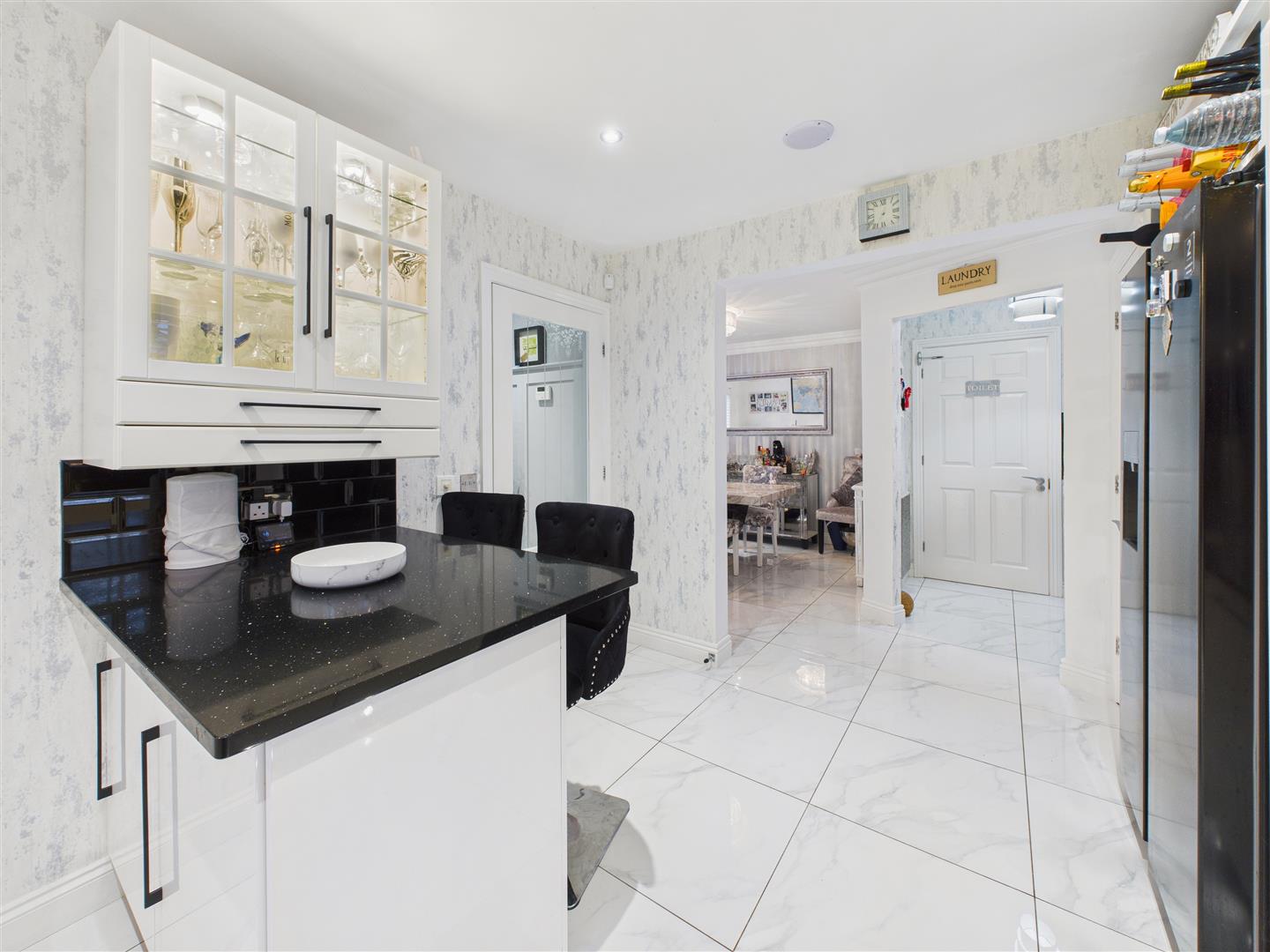 Beautifully appointed, this kitchen features sleek high-gloss units with granite worktops and a peninsula breakfast bar. The layout includes soft-closing drawers, glass-fronted storage, and a suite of integrated appliances comprising a double oven, hob, microwave, and dishwasher, alongside space for an American-style fridge freezer. Tiled surrounds, recessed downlighters, and feature lighting to the kickboards and pelmets finish the room. Two windows provide plenty of light, and a corner cupboard offers a discrete space for the boiler and utility items.