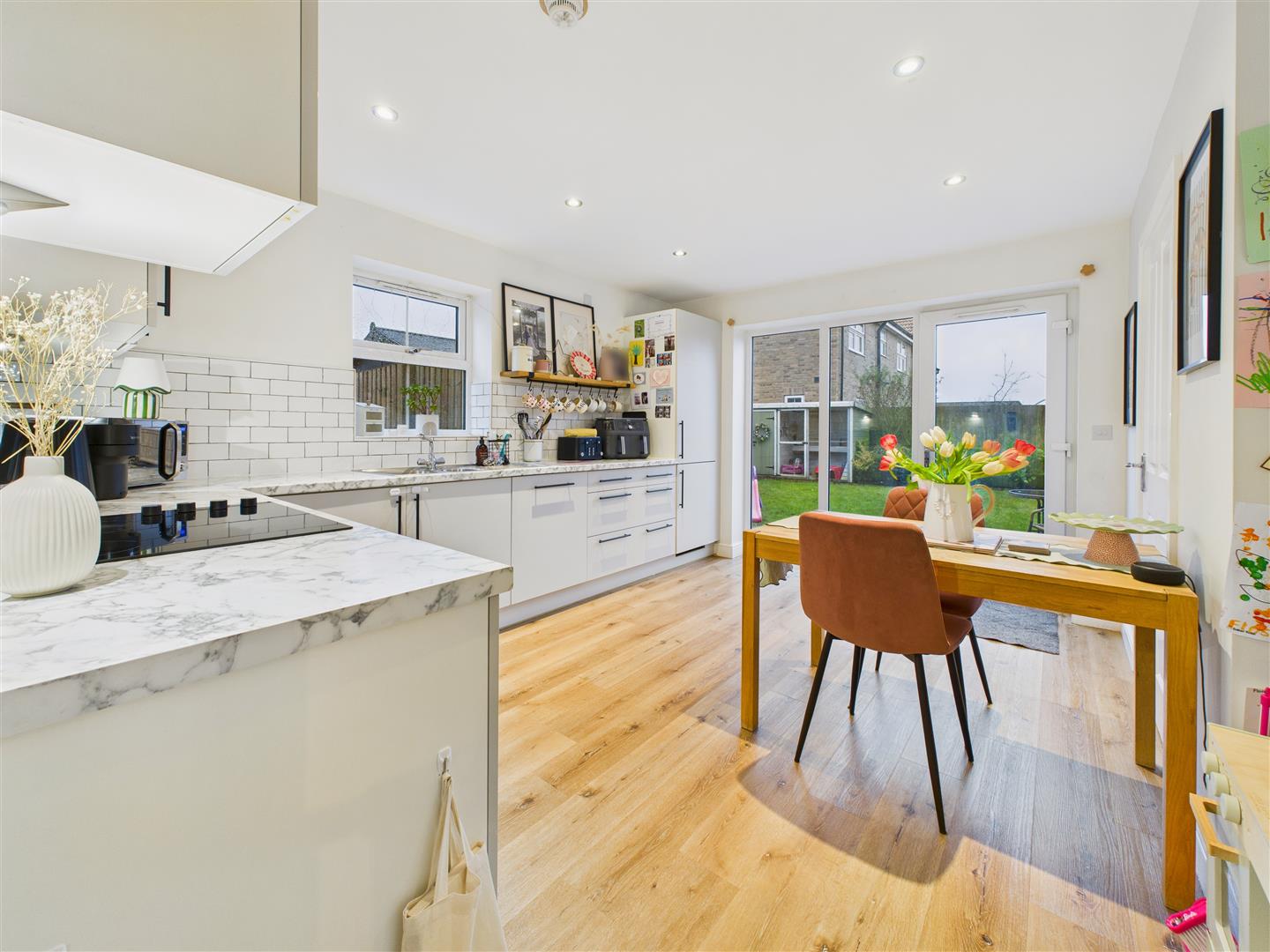 A stylish and convenient space, with the kitchen presenting fitted units and worksurfaces alongside integrated appliances including fridge-freezer, dishwasher and oven. There is a four-ring induction hob with extractor canopy above complimented by a tiled splashback surround throughout. A one-and-a-half sink & drainer sits beneath a window to the side, whilst two picture windows look out to the rear garden. A door opens onto the rear patio.