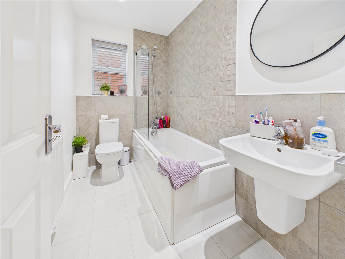 Contemporary bathroom with tiled floor and surround, comprising bath with shower fitting & screen, wash-hand basin and low-flush W.C. beneath window to the side elevation.