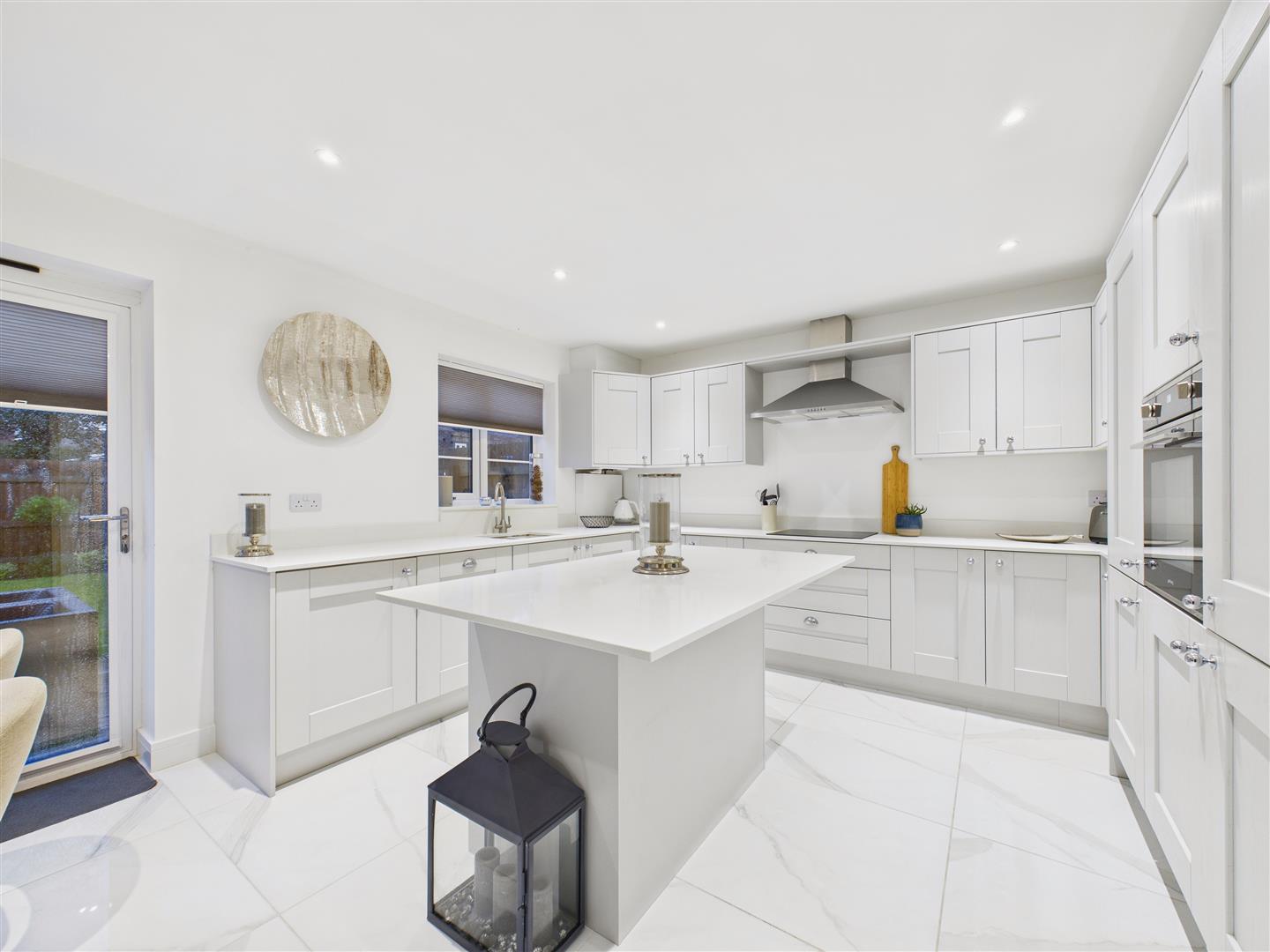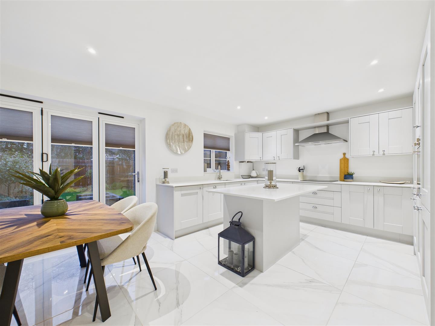 Contemporary kitchen/diner with an island centrepiece, featuring fitted shaker-style units, quartz worksurfaces and a range of integrated appliances including dishwasher, fridge-freezer and oven. A one-and-a-half sink & drainer sits beneath a window to rear and there is a four-ring induction hob with filter unit above. Adjacent to the kitchen is a dining area, with a set of bi-fold doors opening out to the rear patio.