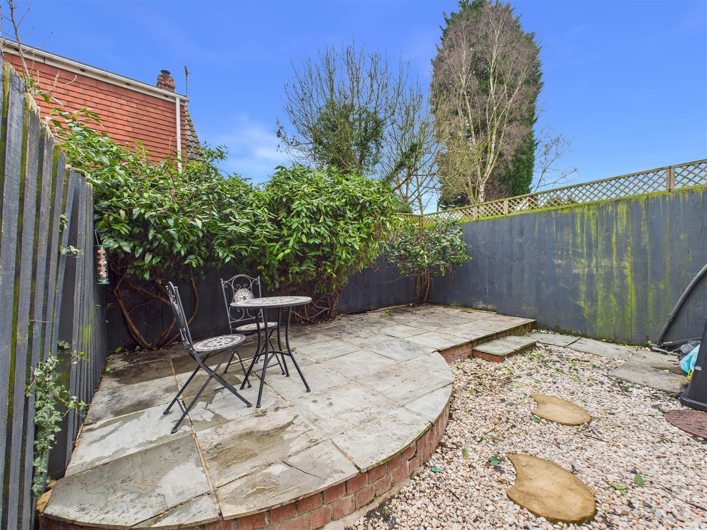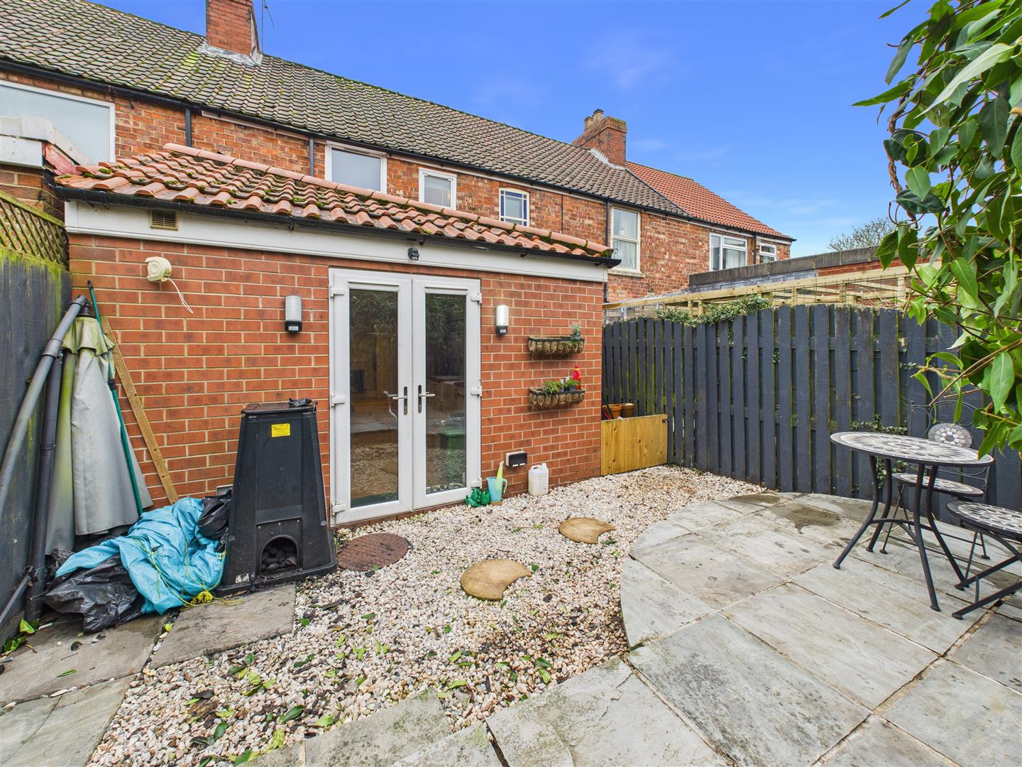 The property includes a low-maintenance front garden and a private rear courtyard with a patio area, perfect for outdoor dining within a secure fenced boundary.