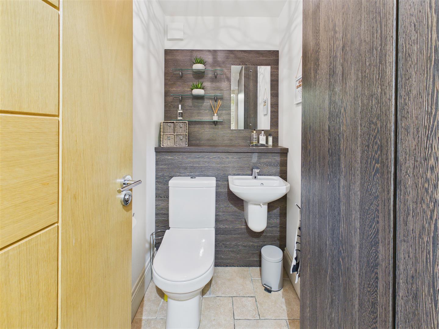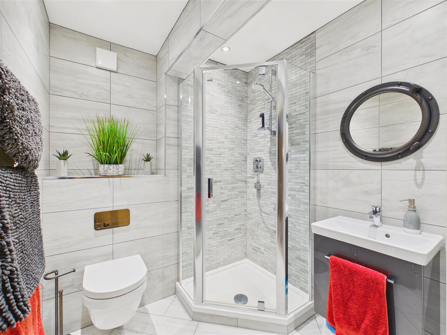 A stylish suite comprising concealed flush Villeroy & Boch W.C. and matching wash hand basin with Hansgrohe mixer tap over. "Walk in" shower area with glazed partition, rainhead and handheld shower system, contemporary tiling to walls and floor, heated towel rail.