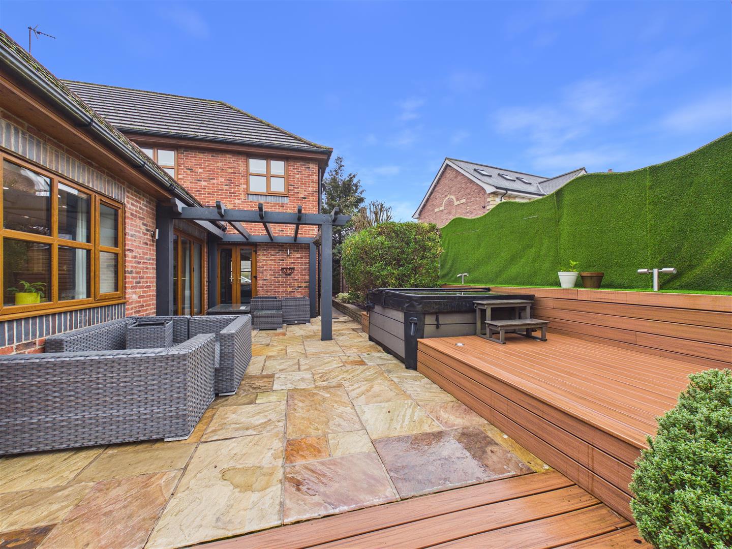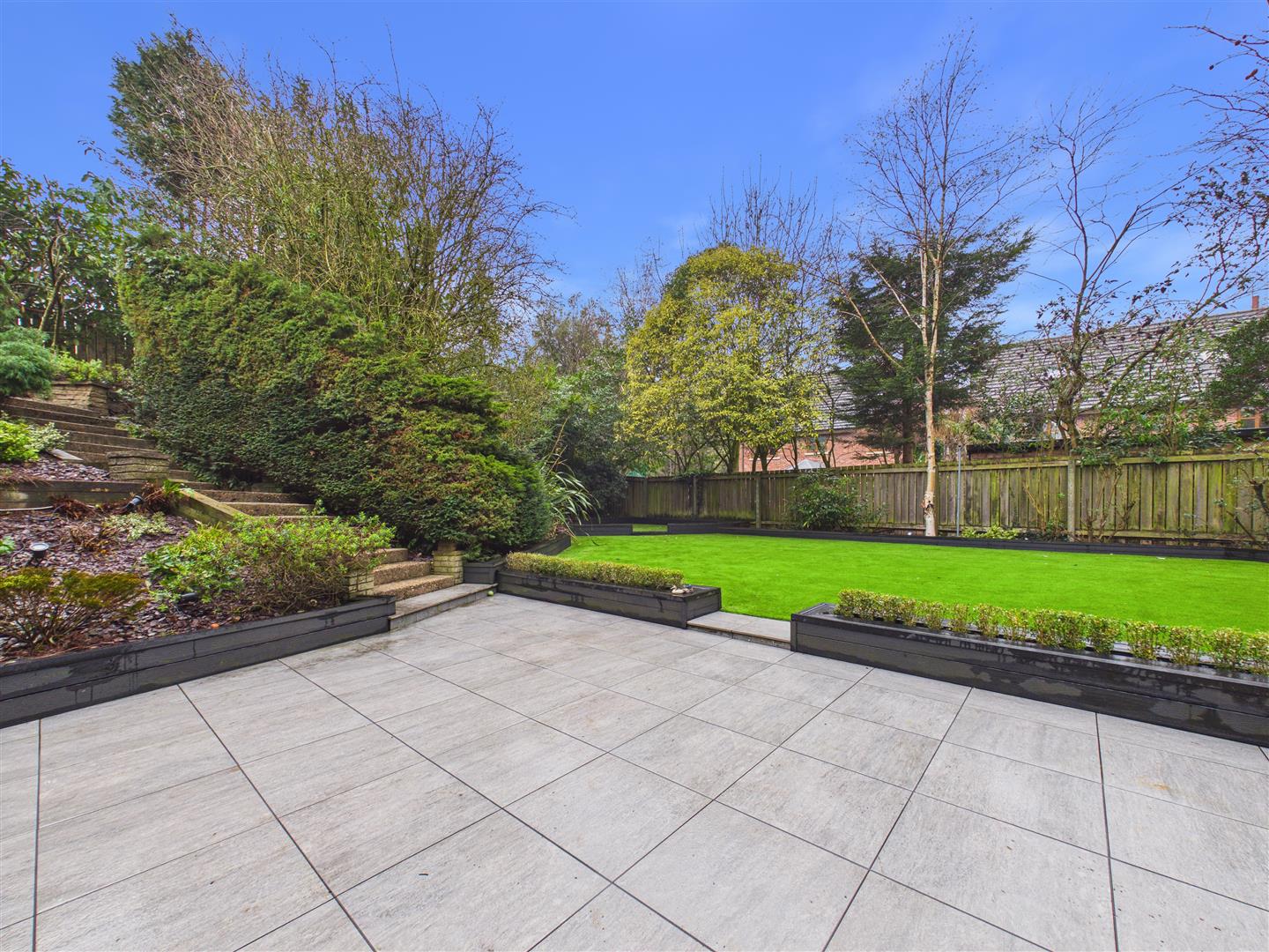 The property has a frontage to Heads Lane with a brick and wrought iron surround. Vehicle and pedestrian access is actually gained via the block set "Lodge Gardens" cul-de-sac and a sliding automated wrought iron gate opens to the forecourt. Extensively block set, the forecourt provides turning space and parking for a number of vehicles. A full right of access is permitted into the cul-de-sac of Lodge Gardens where the access to the basement double garage is located. A remote up and over roller door provides access opening to the garage with measure approximately 29'11" x 16'10". As the property occupies a sloping site, the garden comprising an extensive decked and paved terrace accessible from the living accommodation to the rear. There is also a hot tub. Both concrete steps and a spiral staircase lead down to the bottom garden area with artificial grass and mature borders which providing much seclusion. There is also a treehouse located to one corner of the garden.