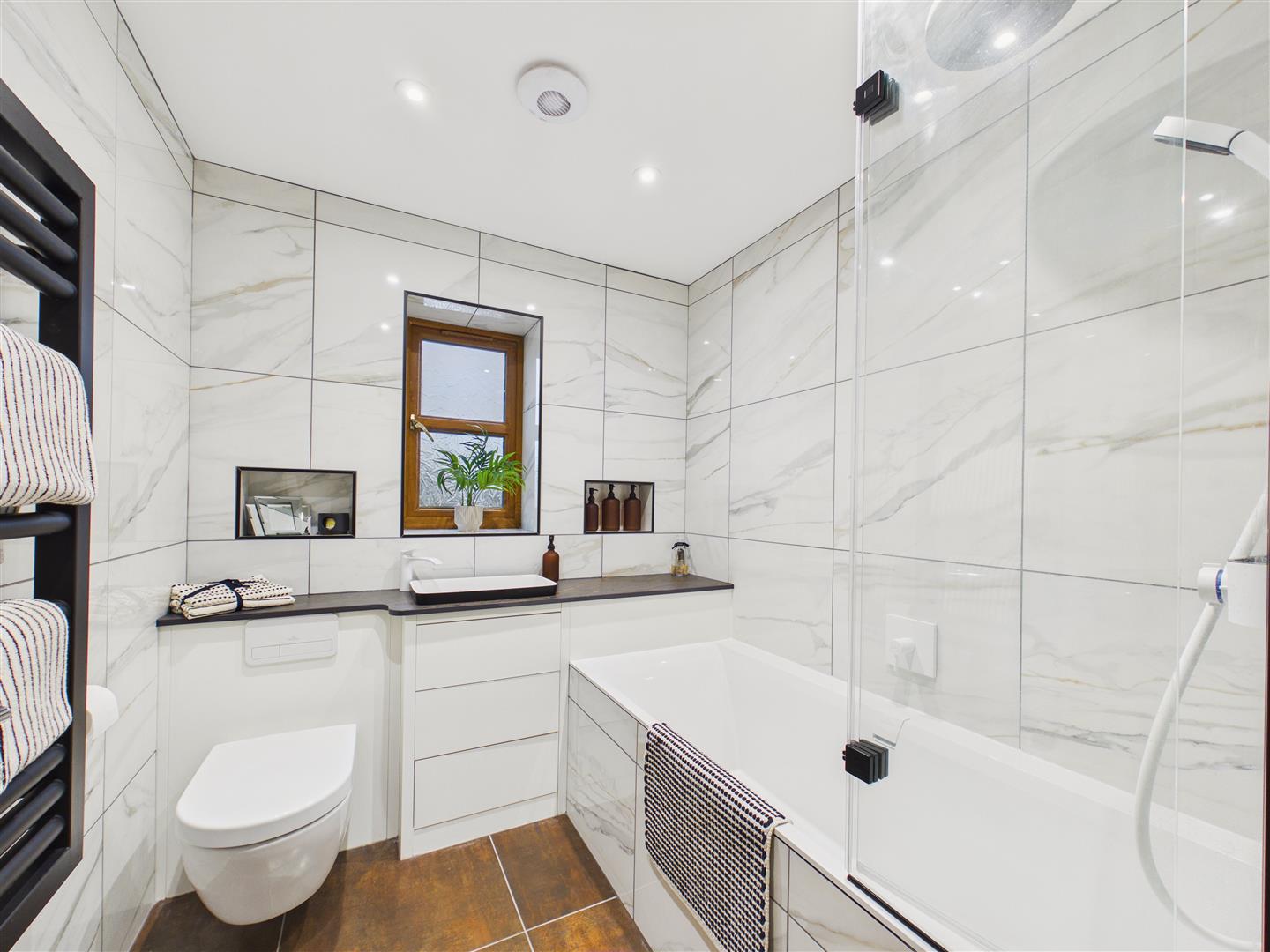 A stylish suite comprising fitted furniture with concealed Villeroy & Boch W.C., designer wash hand basin with Hansgrohe mixer tap, Villeroy & Boch bath with Hansgrohe shower system above with rainhead and handheld shower, glazed partition. Contemporary tiling to walls and floor, heated towel rail.
