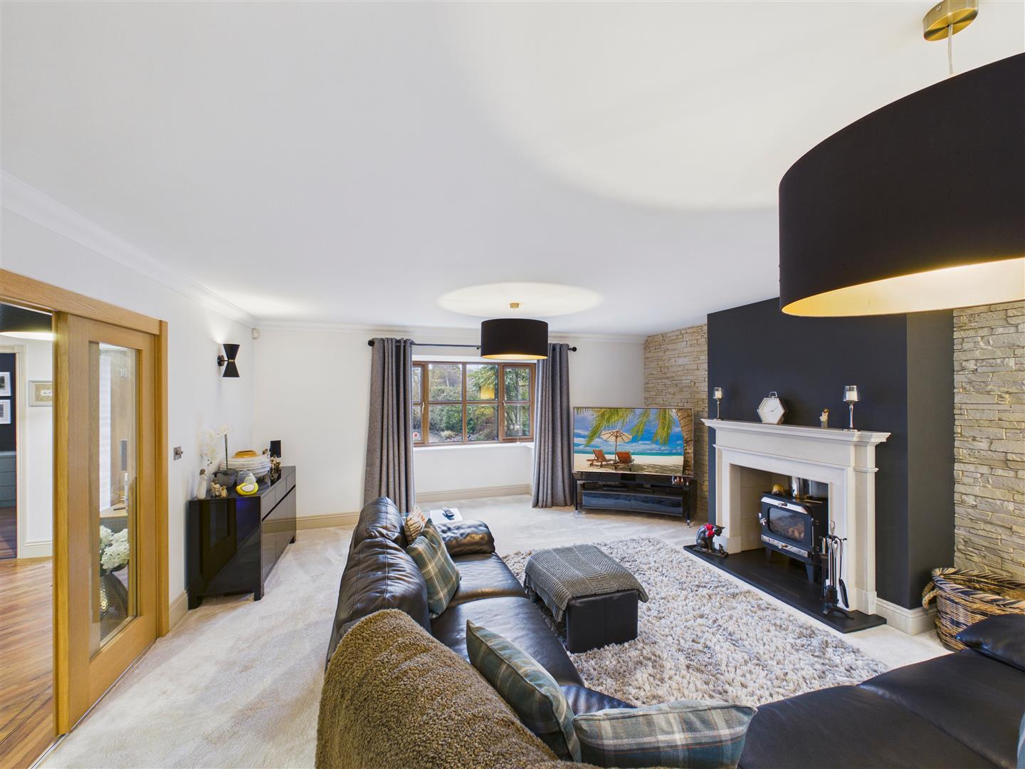 An elegantly proportioned room having as its focal point, a beautiful limestone fire surround housing a contemporary log burner upon a marble hearth. Stone faced feature walls to each side of the chimney breast. Bay window to front, window to side and double doors leading out to the rear terrace.