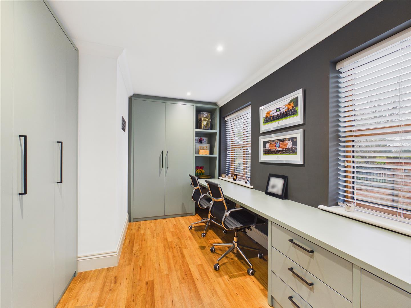 Extensively fitted with cupboards drawers and desking. Windows to front and side elevation of the room.