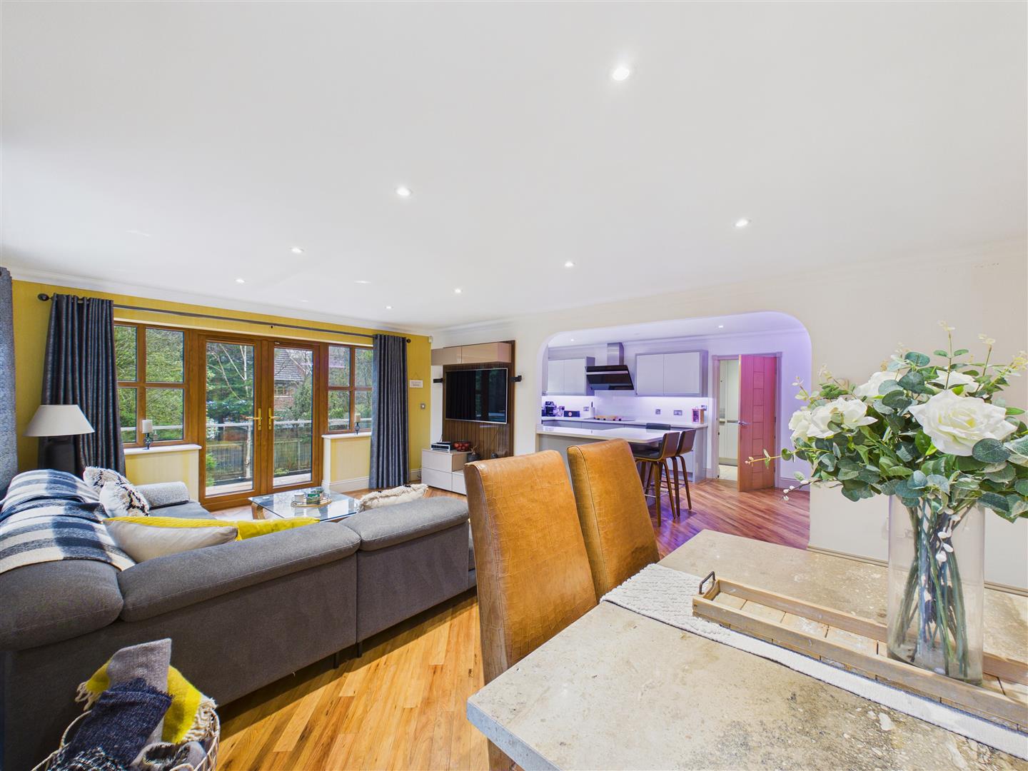 A superb open plan space linking through to the kitchen with plenty of space for dining and settees etc.. Bi fold doors open to the side elevation allowing access out to the paved terrace and double doors to the rear open out to the decked balcony. There is a media wall with wall mounted TV, amtico flooring which leads through into the kitchen.