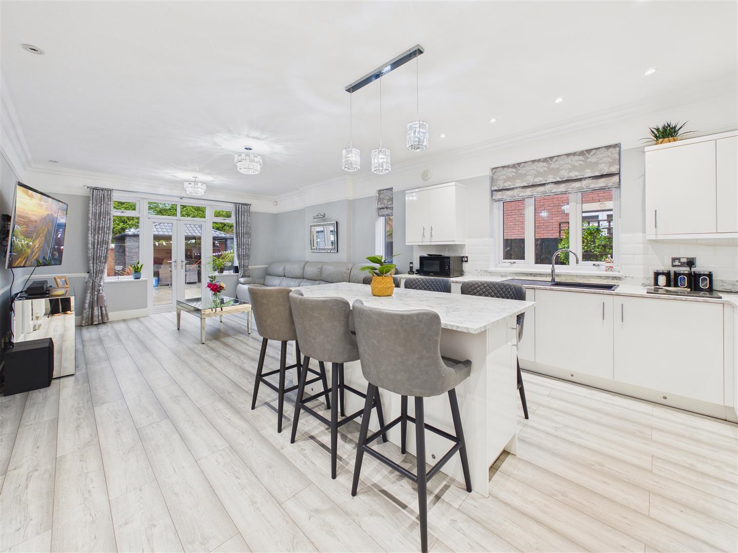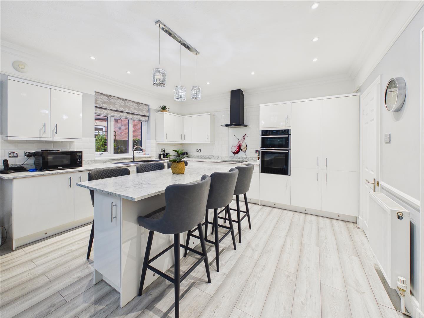 Super space with double doors opening out to the rear patio. The kitchen has a range of contemporary fitted base and wall units with complementing worksurfaces and matching central island. There is a double oven, four ring gas hob with extractor above and a dishwasher. Windows to side. Recessed downlighters.