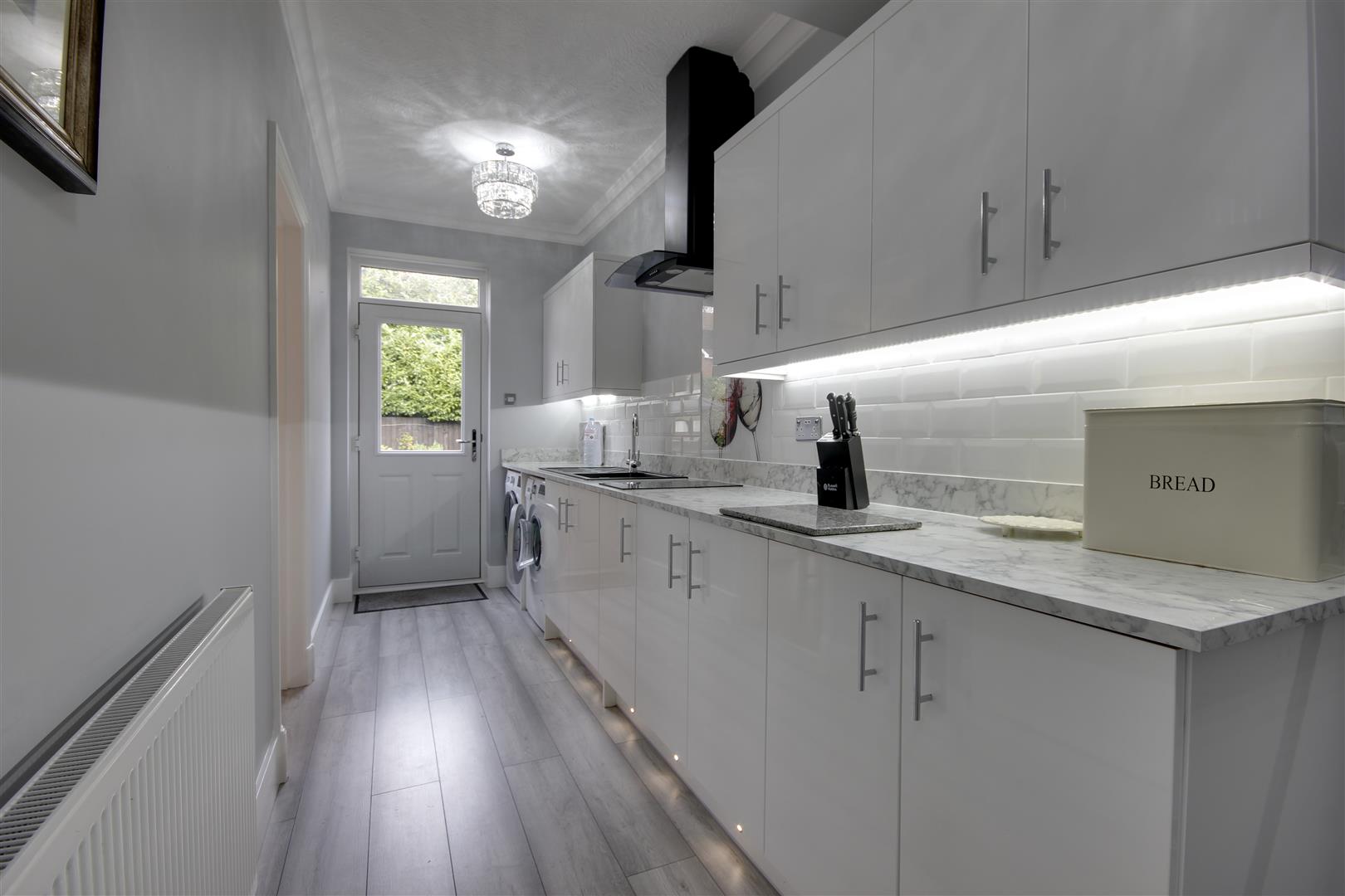 With a range of fitted base and wall units, sink and drainer, 2 ring hob with extractor above, plumbing for washing machine and space for tumble dryer. External access door to rear.