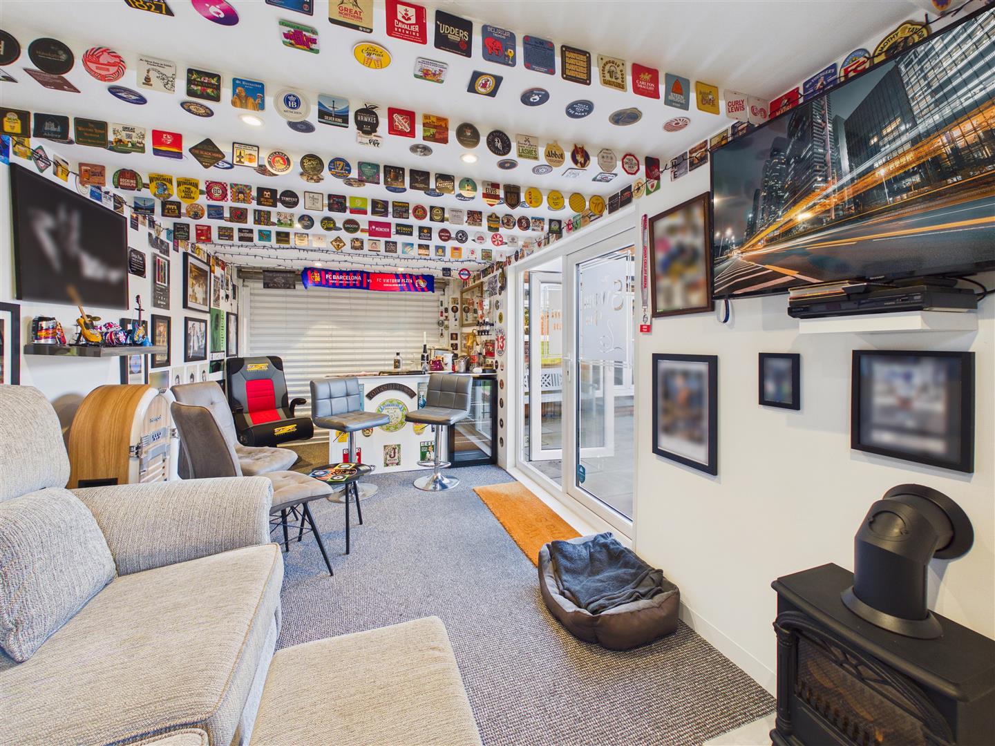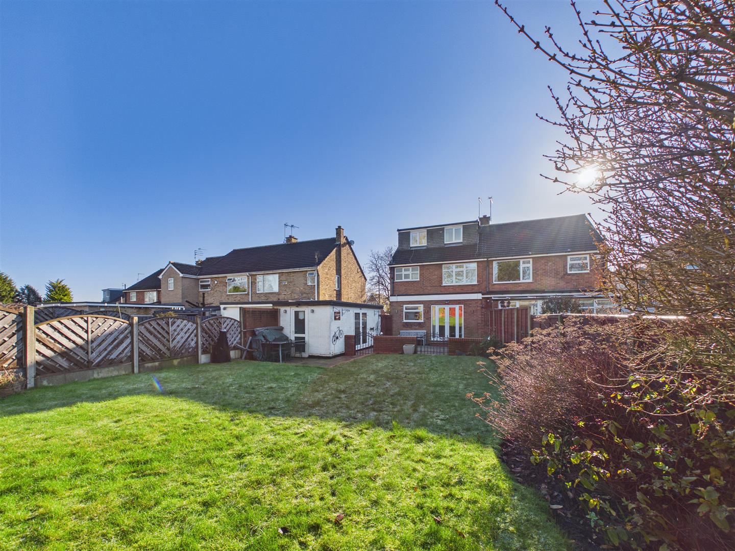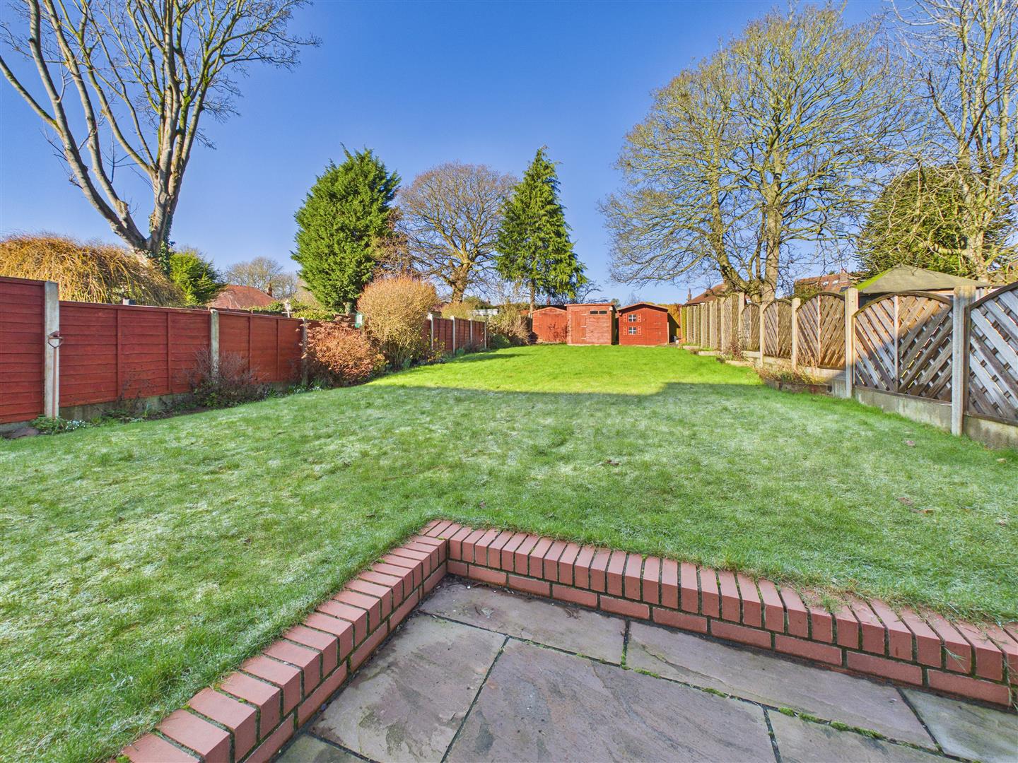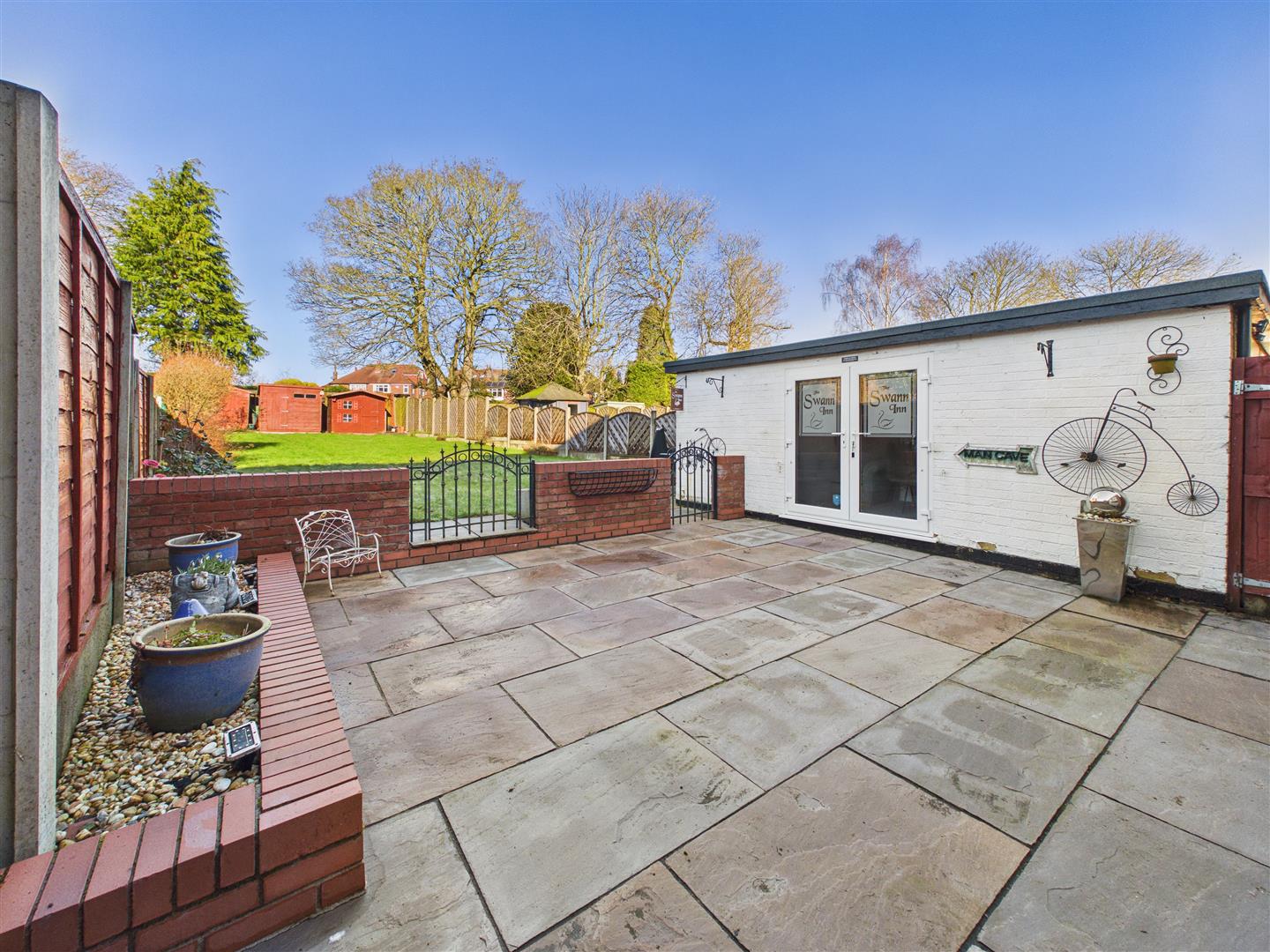 A modern resin driveway provides ample parking and leads to a detached garage, currently utilised as an impressive outdoor bar with power and lightingâthough this could easily be reinstated as a garage if required. The rear garden is a particular highlight, offering much privacy and incorporating a large patio for outdoor dining and an extensive lawn beyond. There are three sheds and fencing to the boundary.