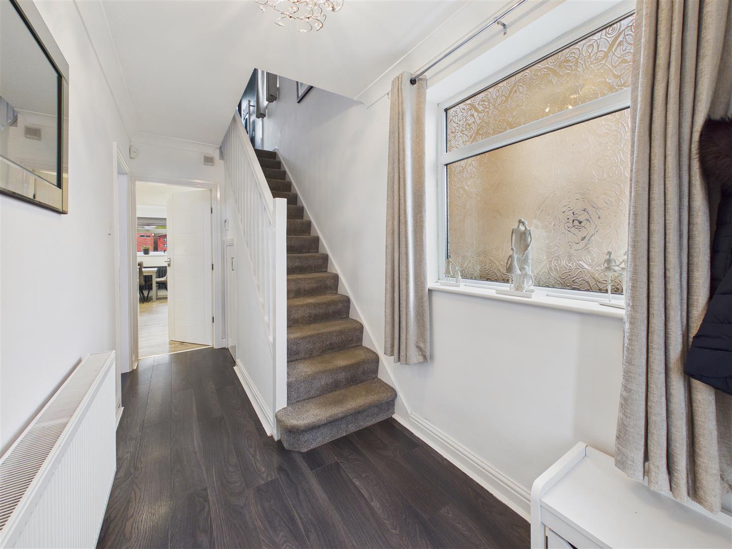 With window to side and staircase leading up to the first floor with cupboard under.