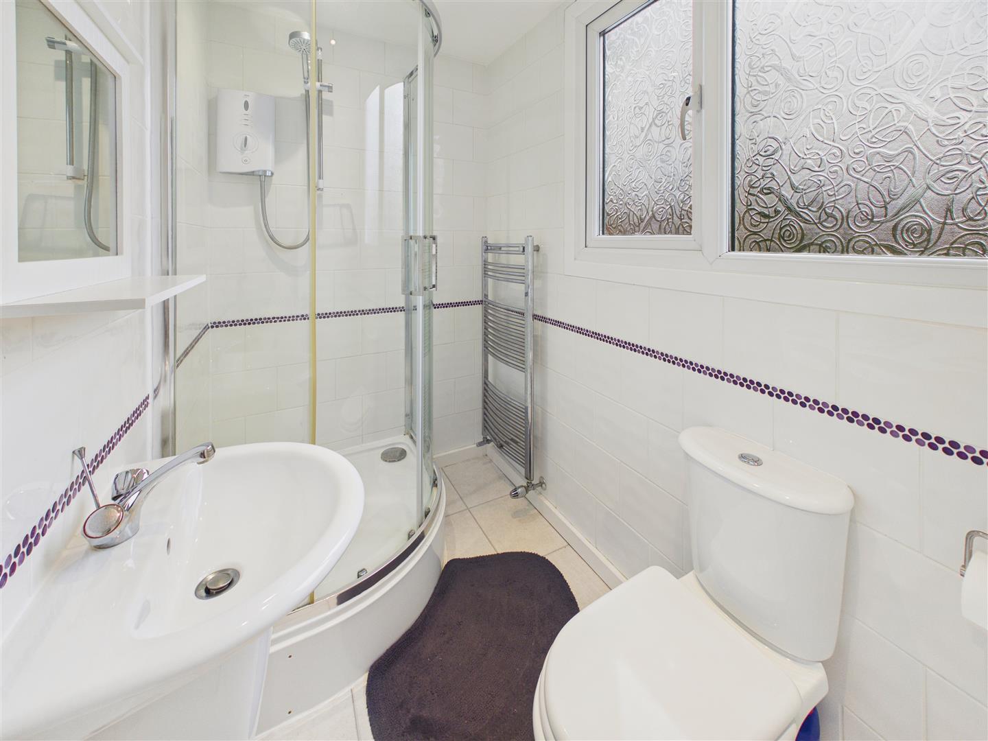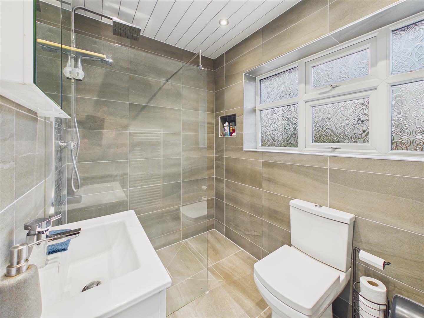 Stylish suite comprising a walk in shower, vanity unit with wash hand basin and low flush W.C. Tiling to walls and floor, electric under floor heating, heated towel rail and window to rear.