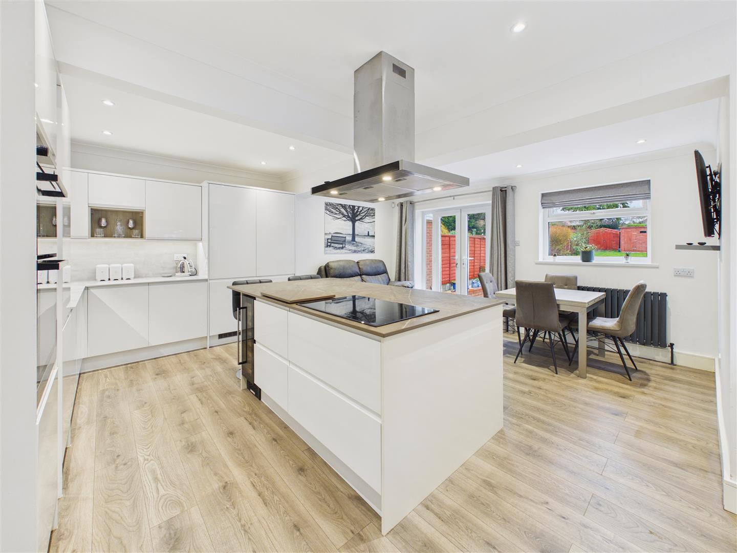 The first floor provides three well-presented bedrooms, two of which include fitted furniture, alongside a stylish shower room featuring the comfort of underfloor heating. The loft has been converted to create a further double bedroom on the second floor, complete with its own en-suite shower room. Outside, a modern resin driveway provides ample parking and leads to a detached garage, currently utilised as an impressive outdoor bar with power and lighting—though this could easily be reinstated as a garage if required. The rear garden is a particular highlight, offering a large patio for outdoor dining and an extensive lawn beyond.