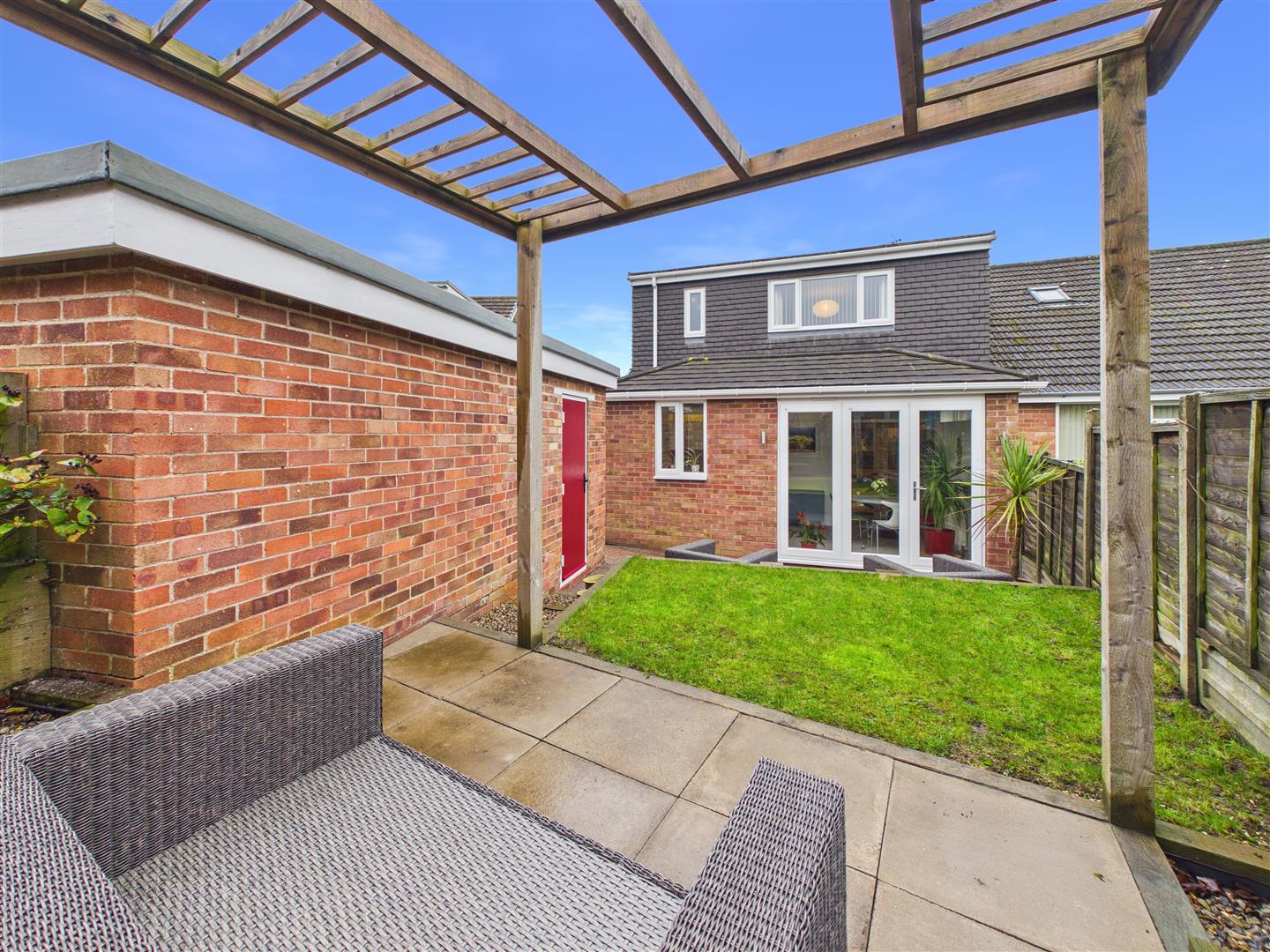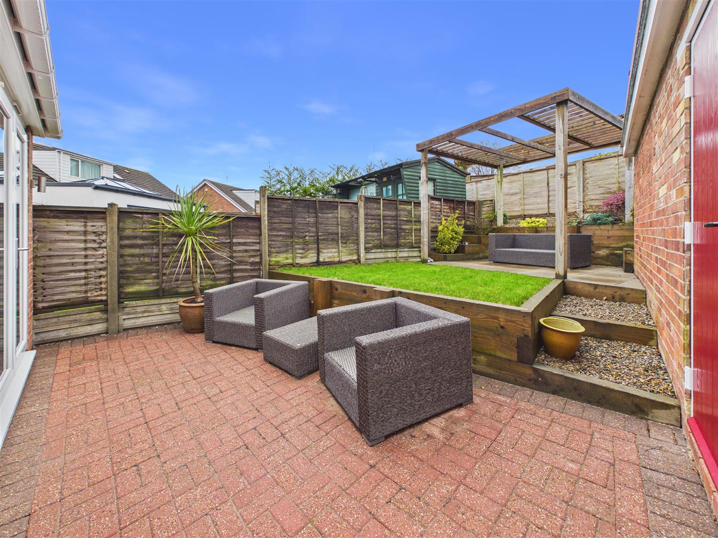 The ground floor is further enhanced by a flexible third bedroom or additional reception room, with a shower room providing convenience and scope for a personal touch. Upstairs, the two large double bedrooms include a main suite featuring walk-in storage and a private en-suite bathroom. Practicality is a key feature of the exterior, with a large block-paved driveway providing ample off-street parking and leading to a single garage. The rear garden has been landscaped to create distinct zones, featuring a lawn with attractive raised planters and a patio under a pergola, ideal for enjoying the peaceful village surroundings.
