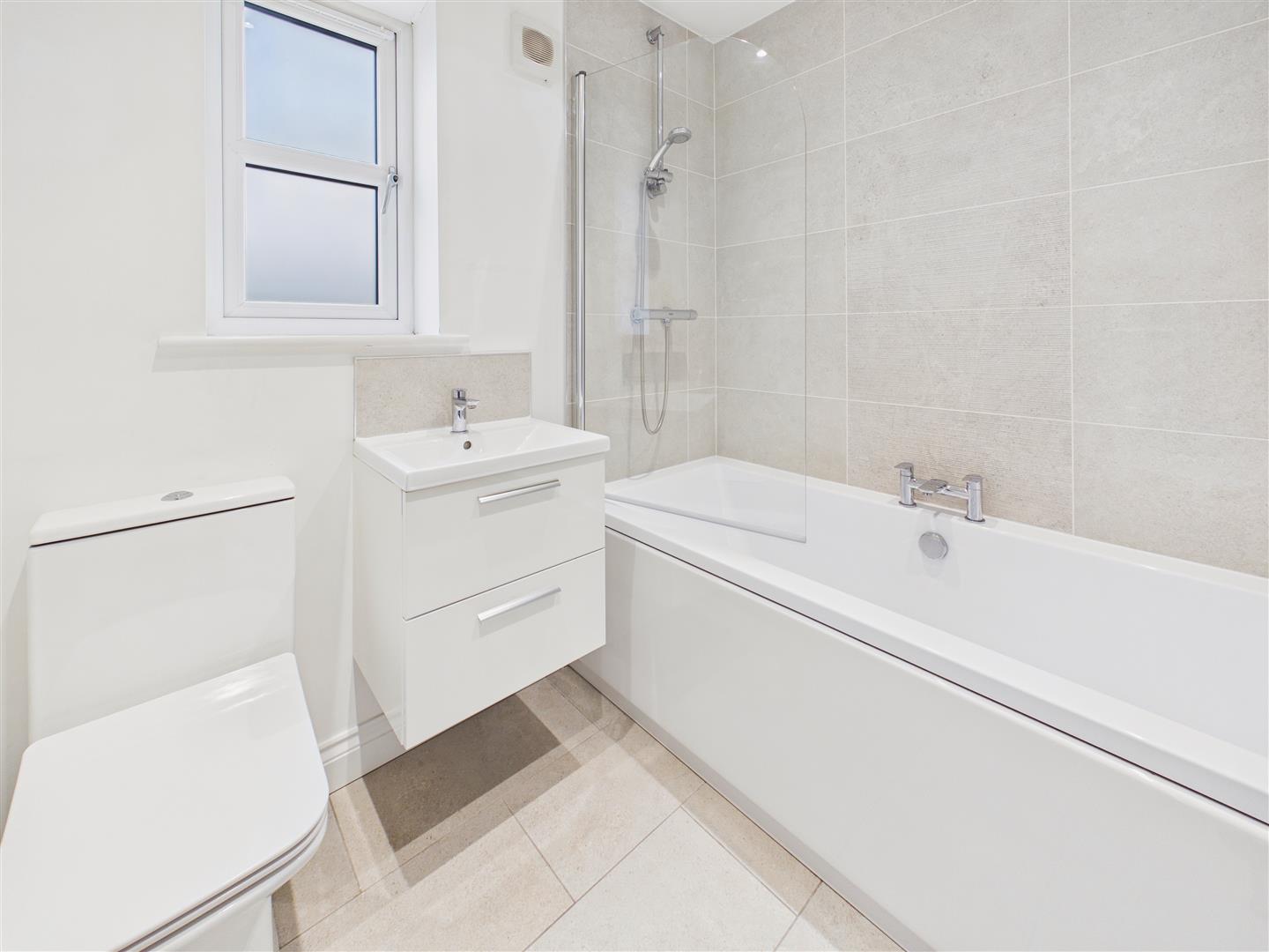 With stylish white suite comprising of low level WC, wash hand basin with drawers, panelled bath with shower over and screen, contemporary tiling to the walls and floors, heated towel rail.