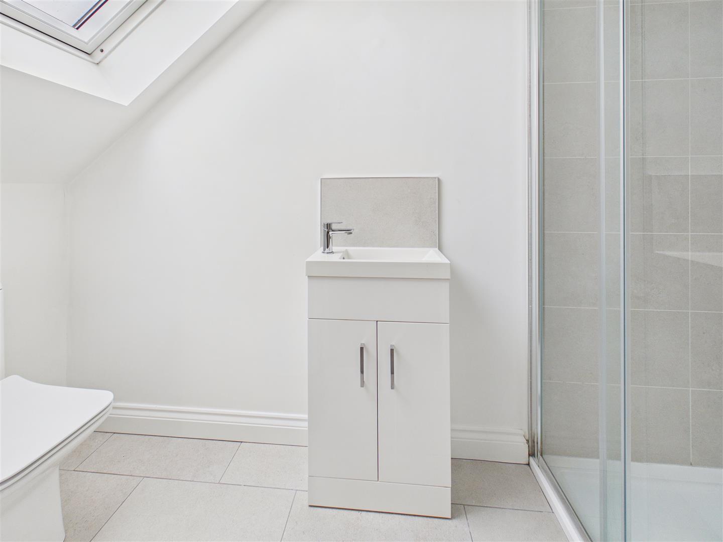 With suite comprising of low level WC, wash hand basin cabinets, shower cubicle with rail head and hand held shower system, tiled surround and floor.