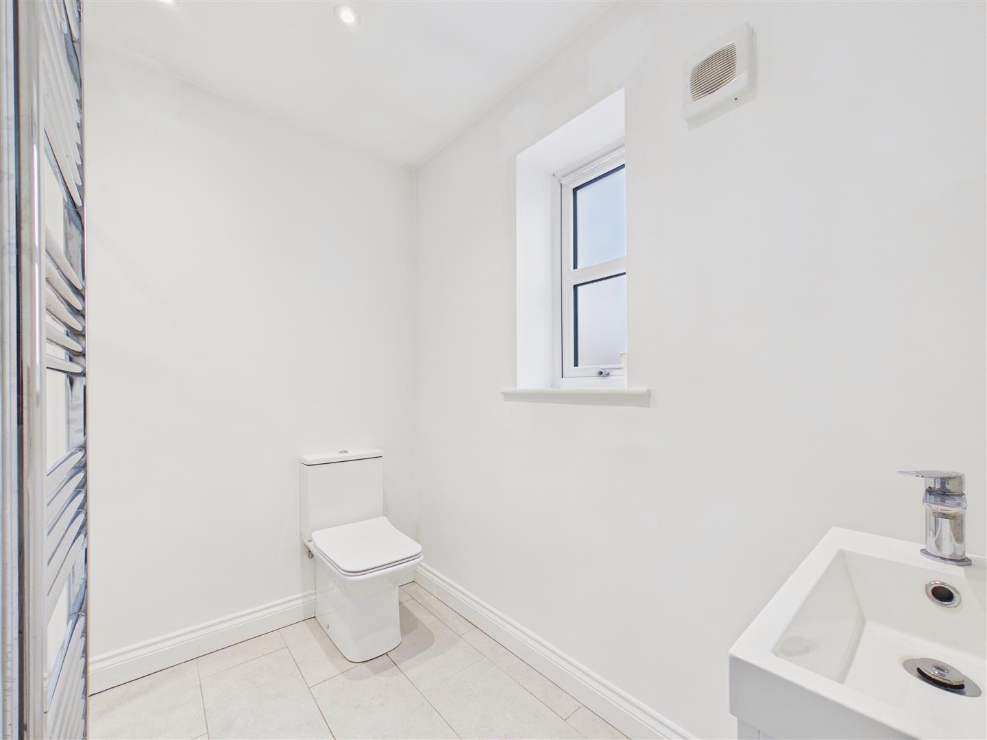 With low level WC, wash hand basin and shower cubicle, tiled surround, heated towel rail.