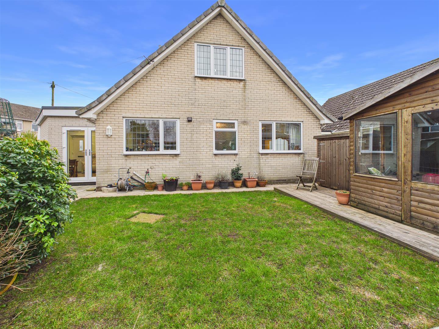 Externally, the property is highly practical. A lawned garden sits to the front, while a generous side drive provides excellent off-street parking leading to the garage. The garage has been partitioned to provide a storage area accessible from the house, with further storage remaining to the front. The rear garden features a central lawn surrounded by timber decking and a patio, offering a pleasant space for outdoor relaxation.