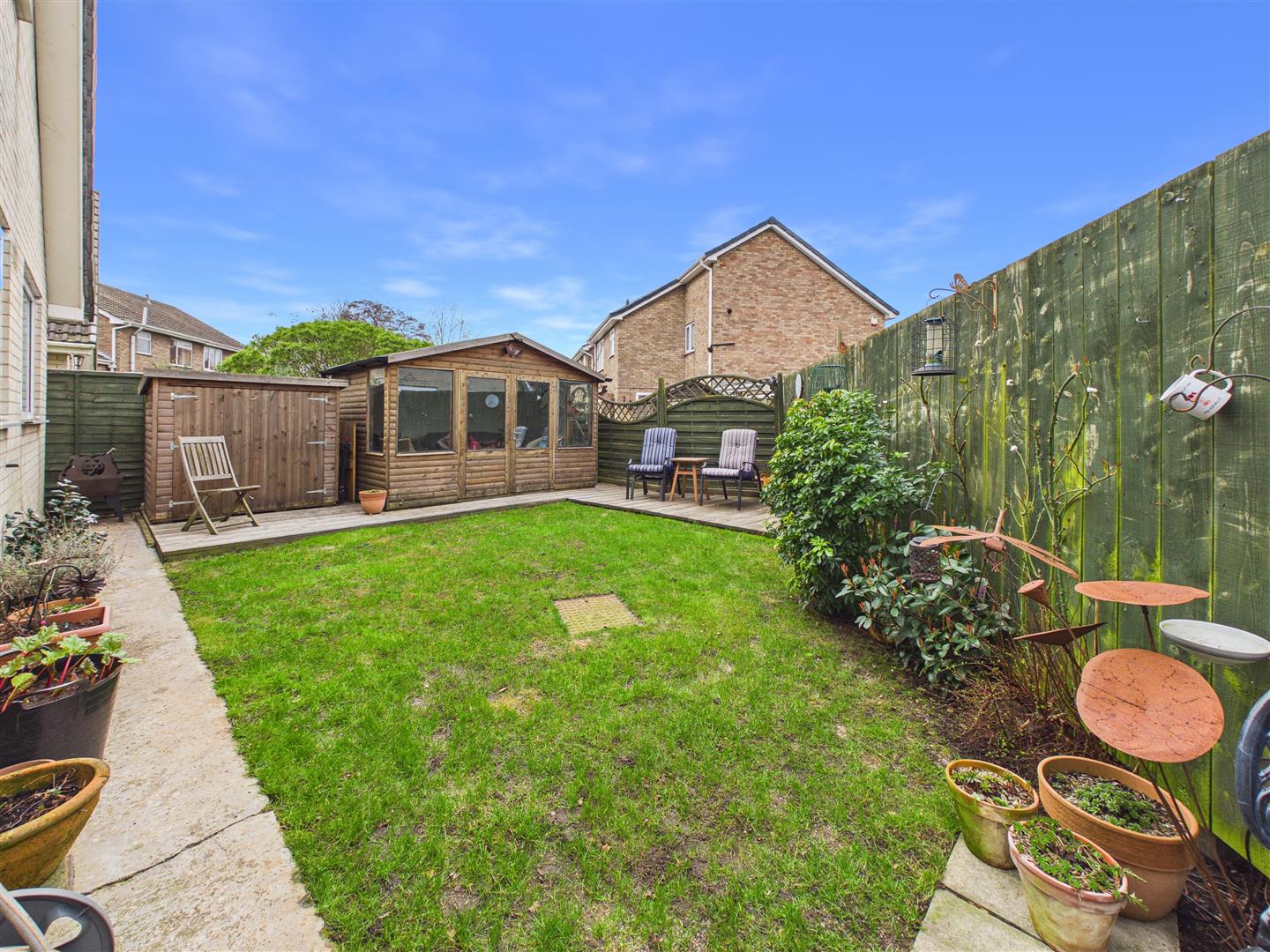A lawned garden sits to the front, while a generous side drive provides excellent off-street parking leading to the garage. The garage has been partitioned to provide a storage area accessible from the house, with further storage remaining to the front. The rear garden features a central lawn surrounded by timber decking and a patio, offering a pleasant space for outdoor relaxation. The summerhouse is available by separate negotiation.