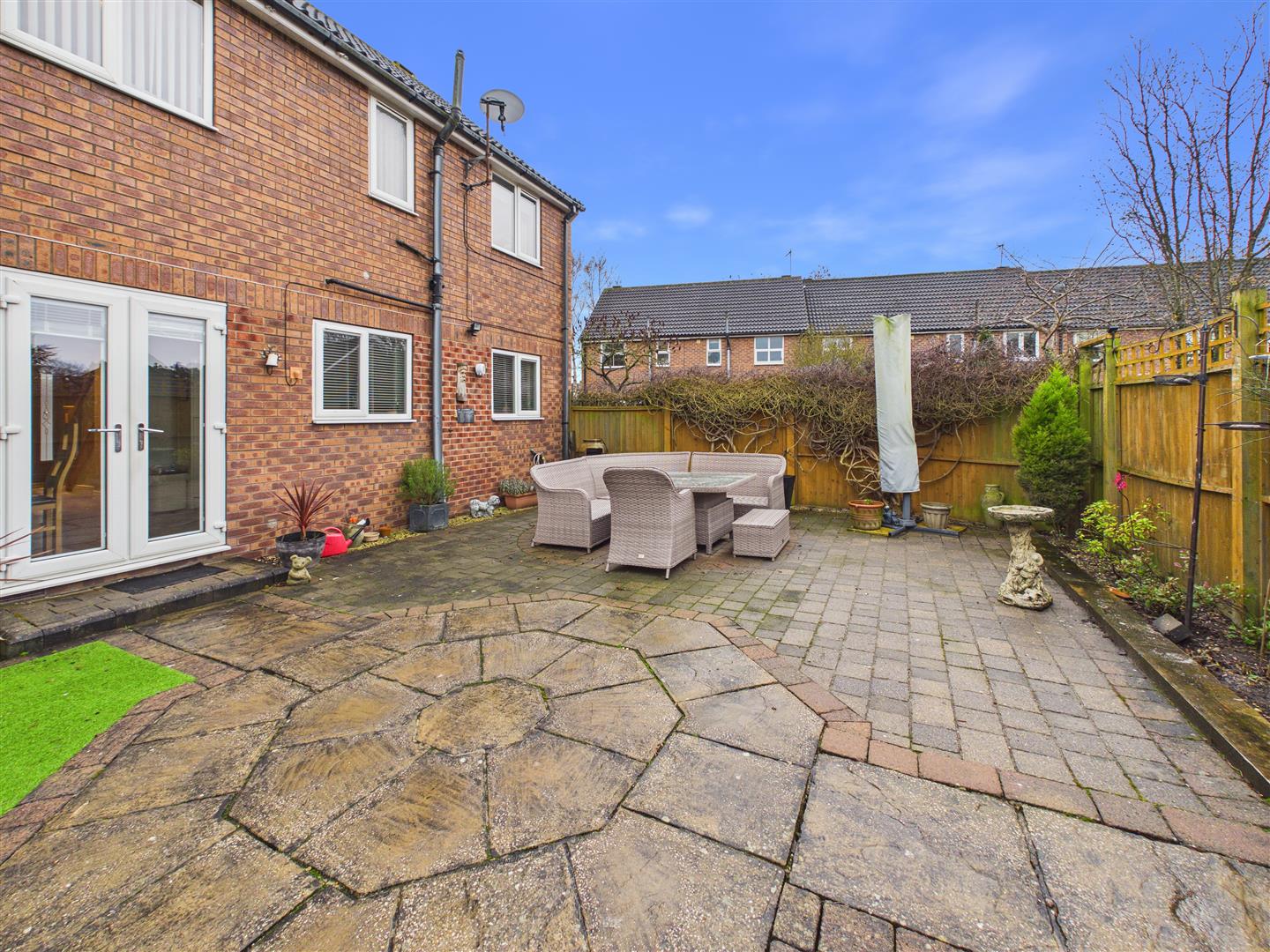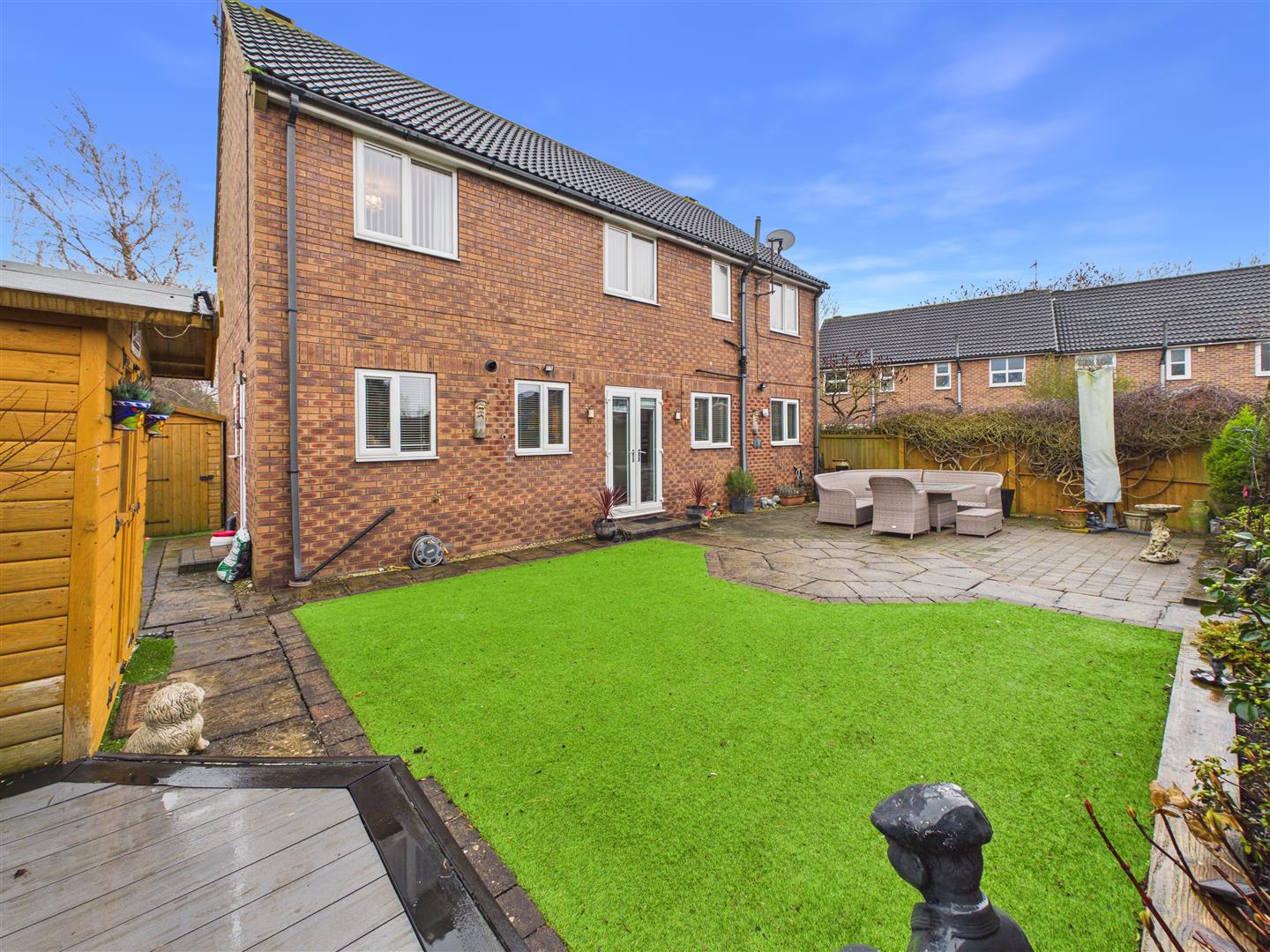 The exterior features attractive gardens to the front, while the rear offers a low-maintenance, westerly-facing space designed to make the most of the afternoon and evening sun. This area includes a patio, artificial lawn, decking, and a versatile summerhouse. To the rear, the property benefits from a single garage and its own driveway and parking for up to four vehicles.