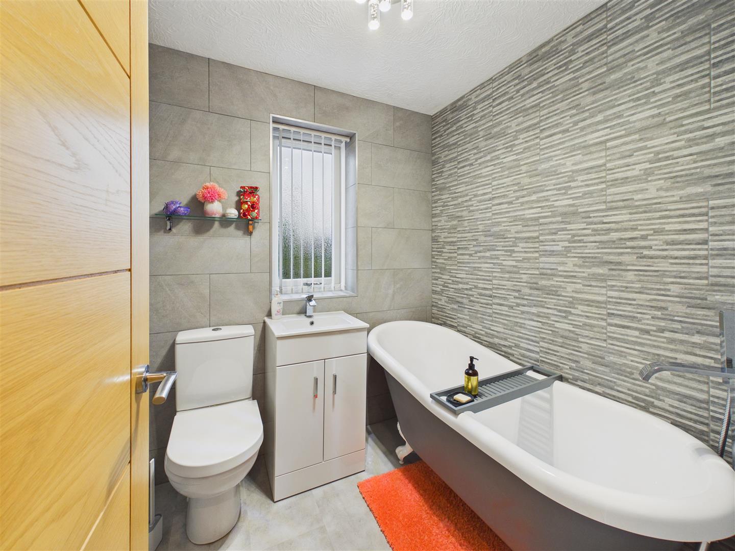 With contemporary suite comprising a slipper bath with freestanding tap, wash hand basin and low flush W.C. Tiling to walls, heated towel rail and window to rear.