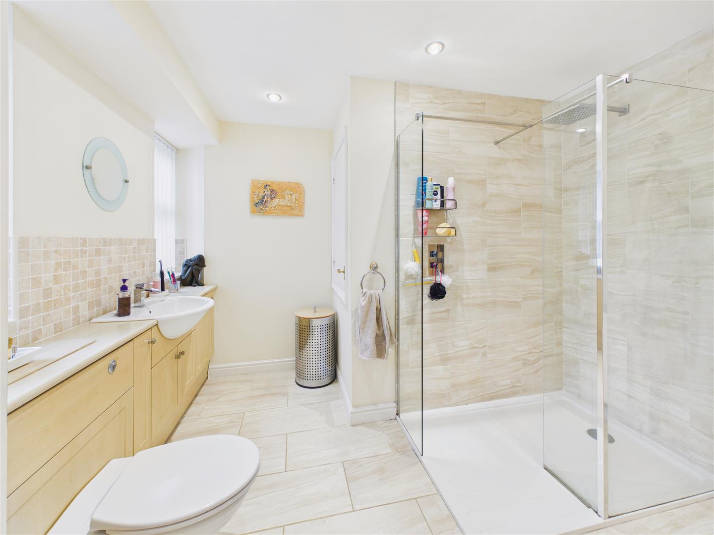 With suite comprising a walk in shower with glass panels, fitted cabinets with wash hand basin and low flush W.C. Heated towel rail, inset spot lights, storage cupboard, tiled floor and windows to the front elevation.