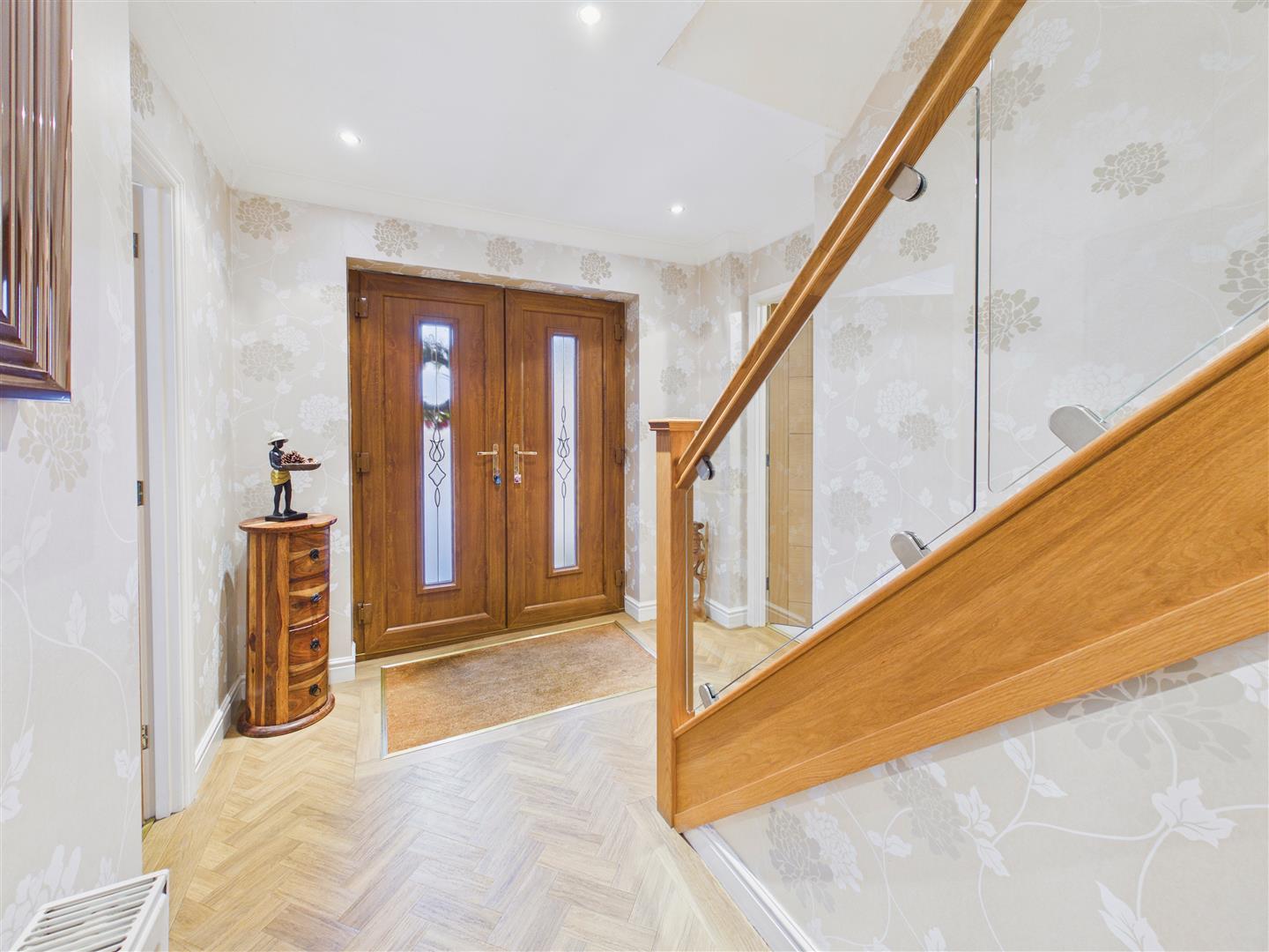 Spacious and welcoming with Karndean flooring and staircase with oak and glass balustrade leading up to the first floor.