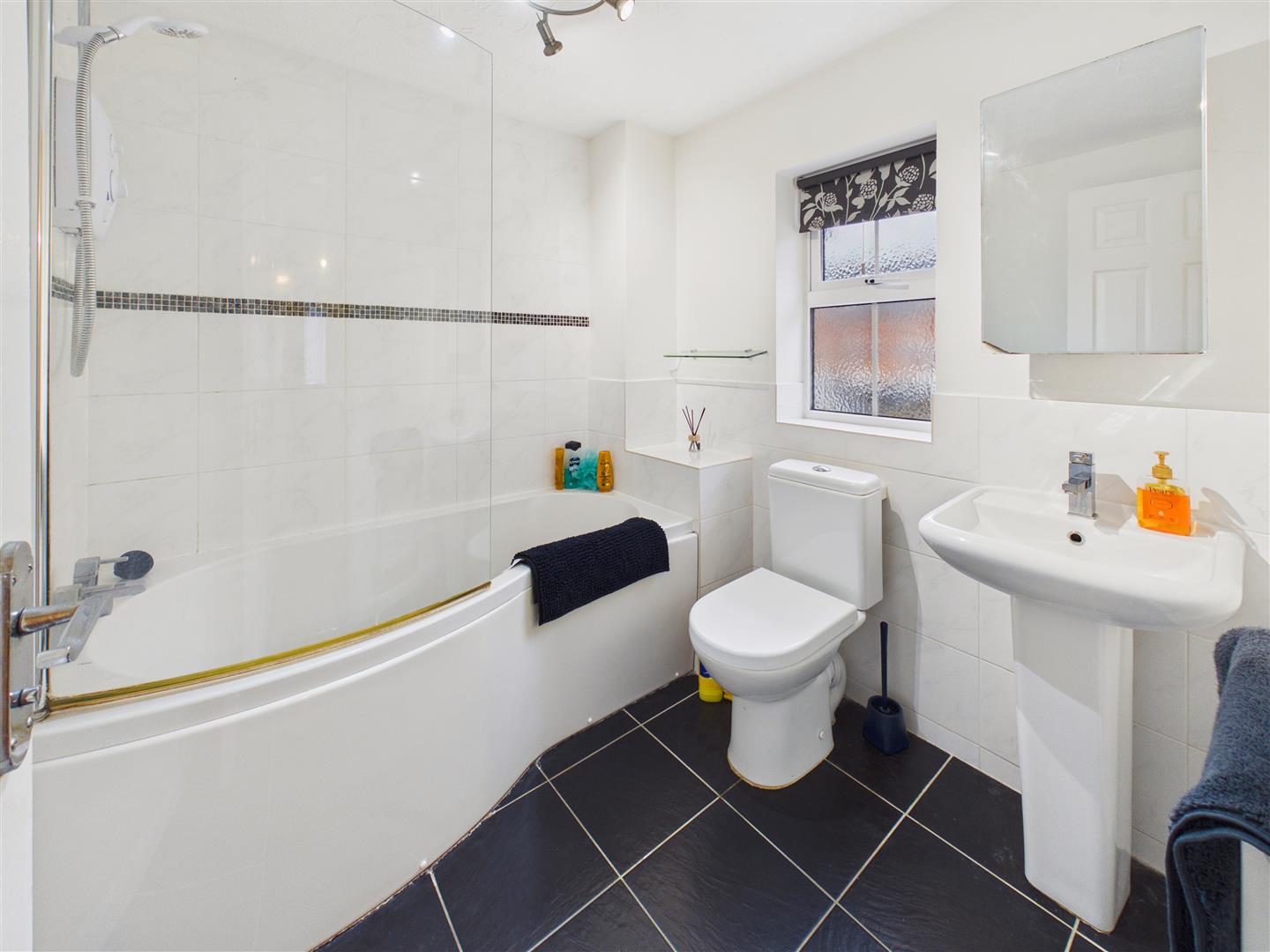 Half-tiled bathroom comprising bath with shower screen and fitting, wash-hand basin and low-flush W.C. beneath window to the front elevation.