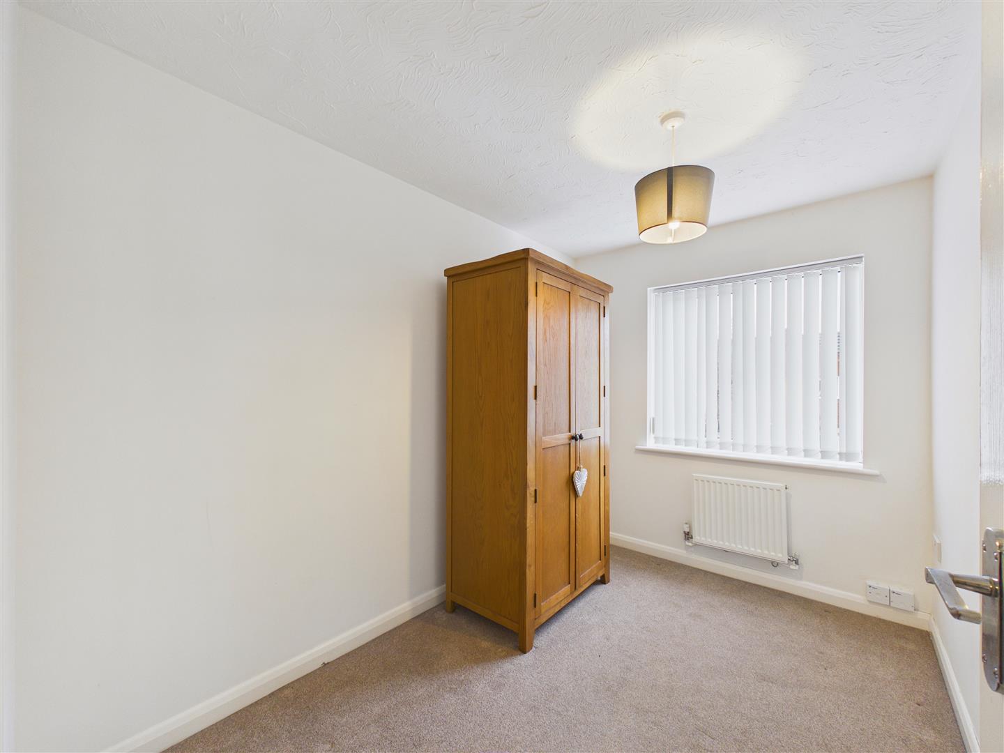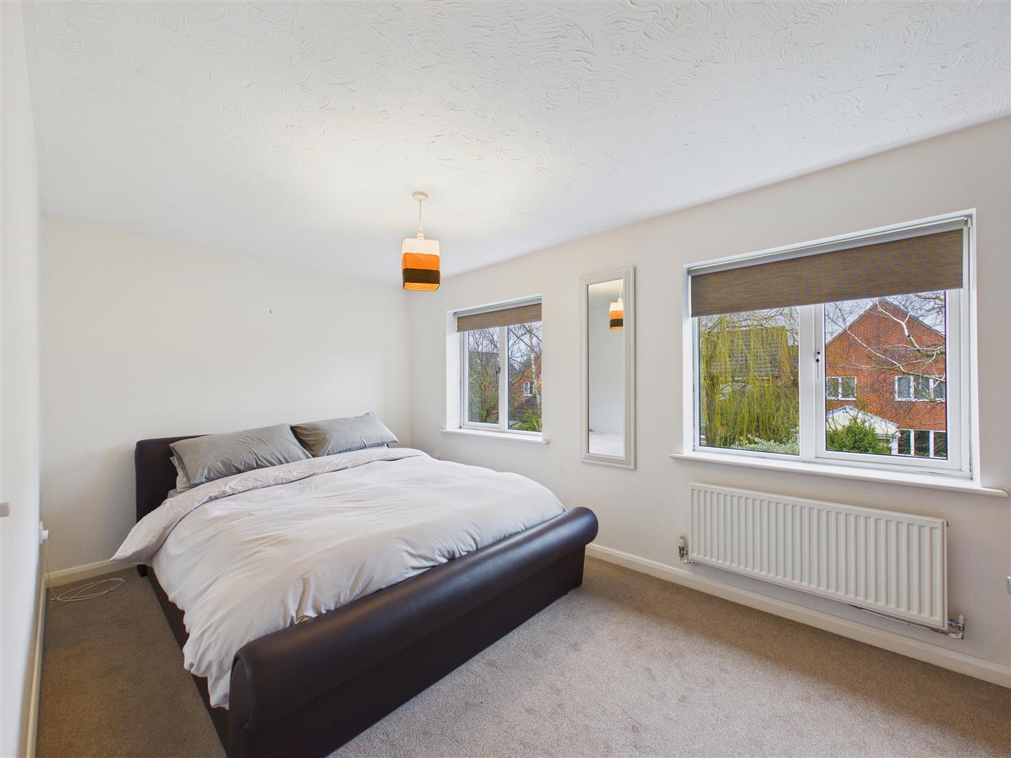 Fitted wardrobes, drawers and media shelf, two windows to the rear elevation.