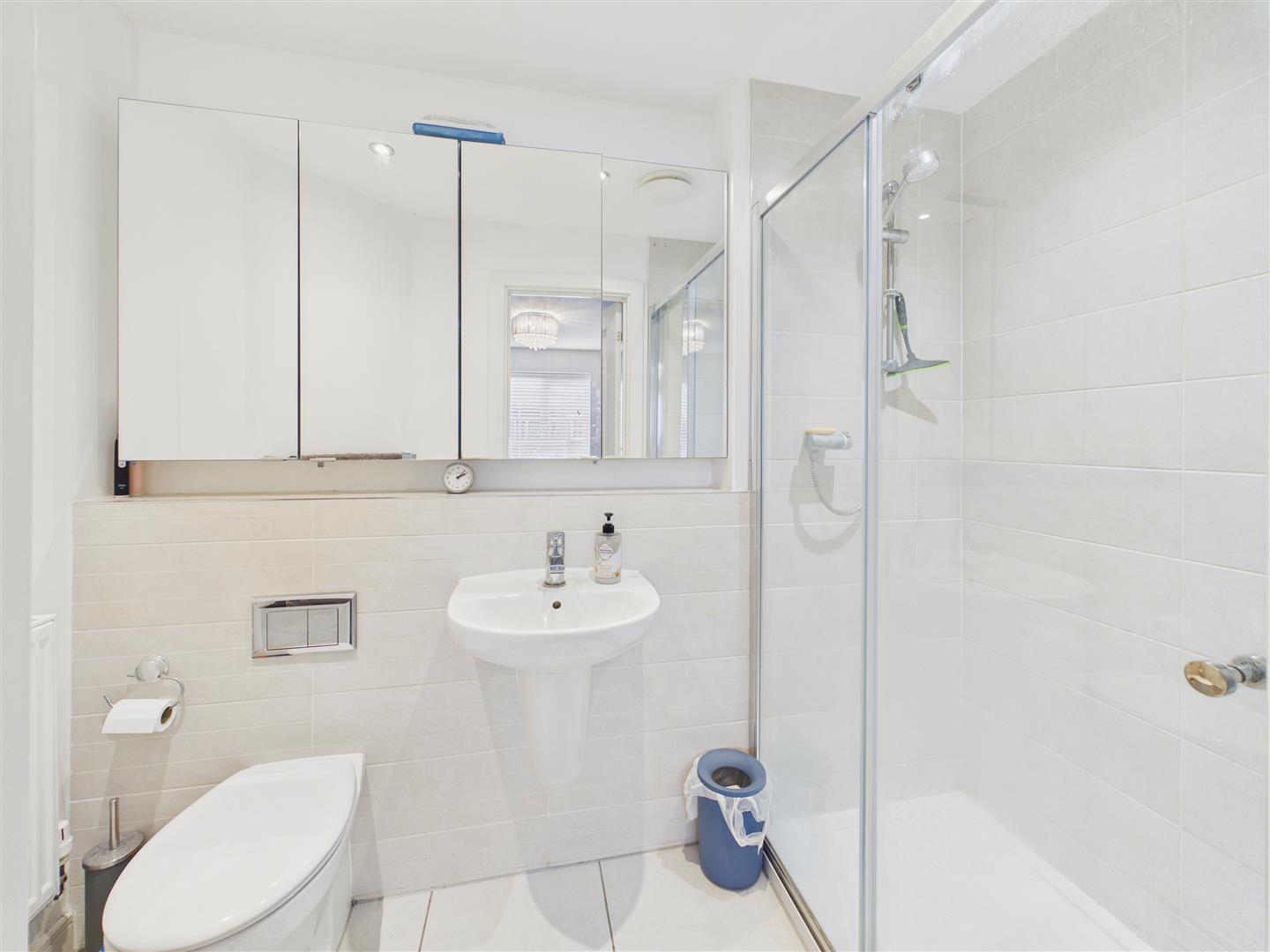 With suite comprising a shower enclosure, wash hand basin and low flush W.C.
