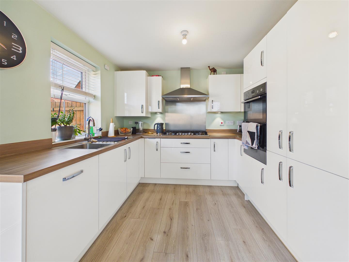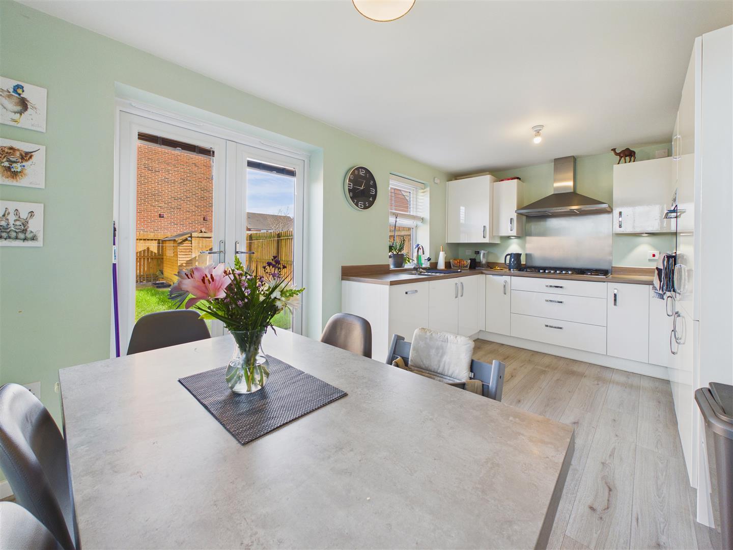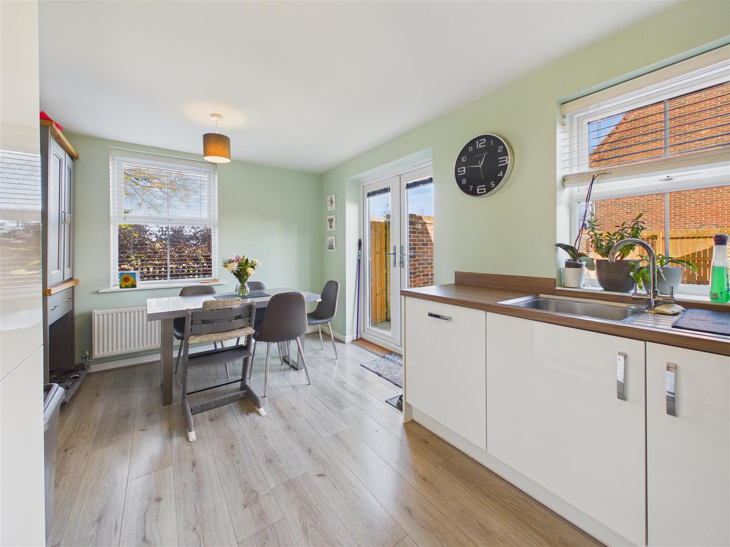 Contemporary kitchen with fitted units and worksurfaces throughout and integrated appliances including fridge-freezer, dishwasher and double oven. There is a six ring gas hob with filter unit above and a sink & drainer beneath a window to the side. Adjacent to the kitchen is the dining area with ample room for a dining table, a window to the front and French doors opening out to the garden.