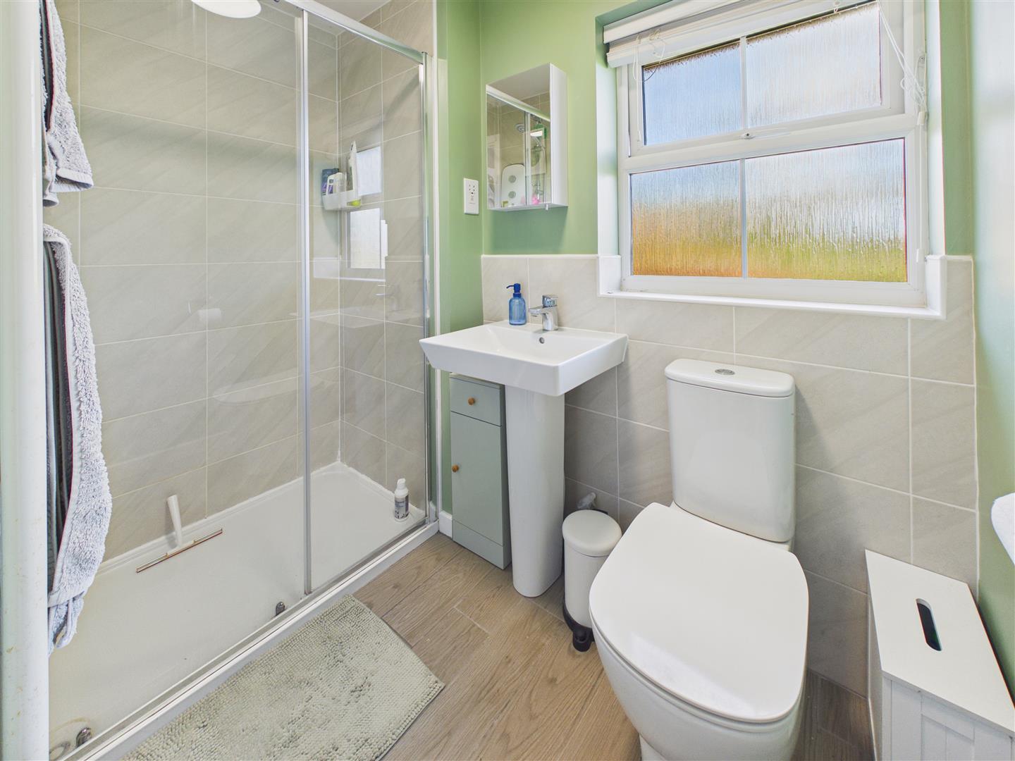 Comprising a shower enclosure with tiled surround, wash-hand basin and low-flush W.C. beneath window to the front elevation.
