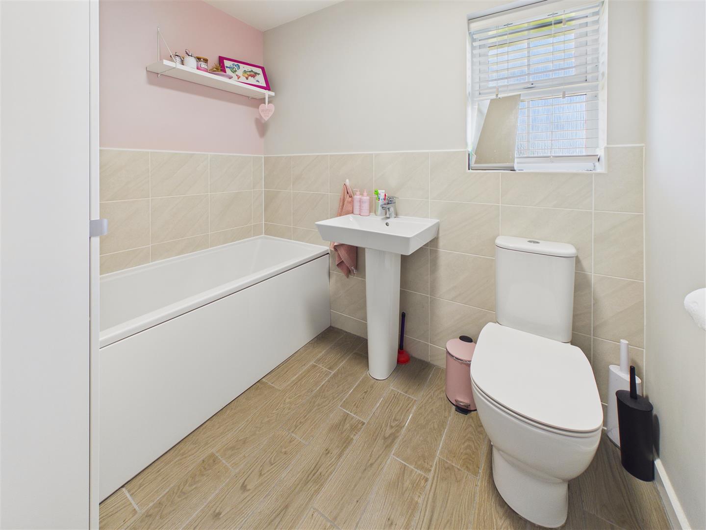 Comprising bath with tiled surround, fitted storage cupboard, wash-hand basin and low-flush W.C. beneath window to the front elevation.