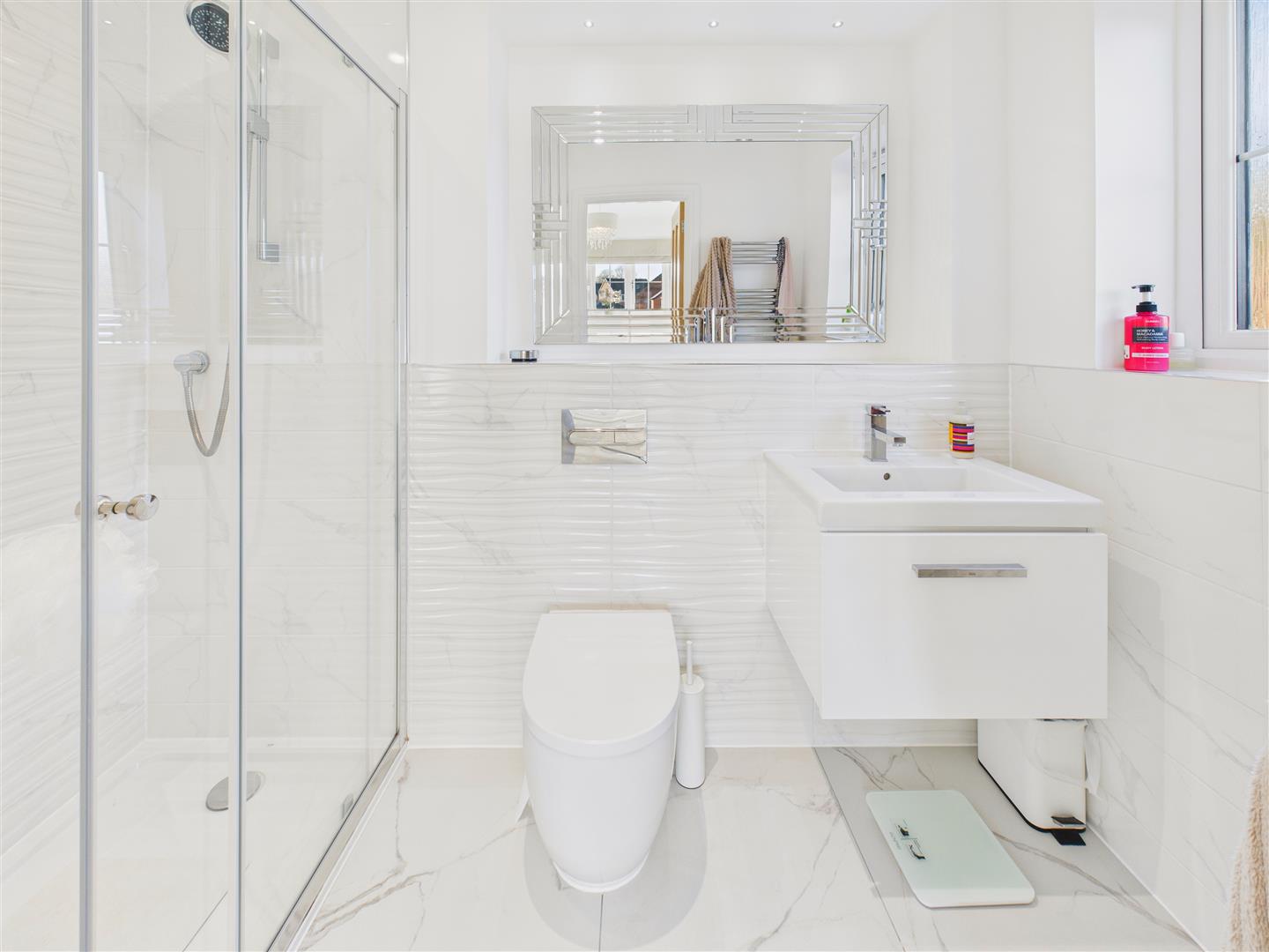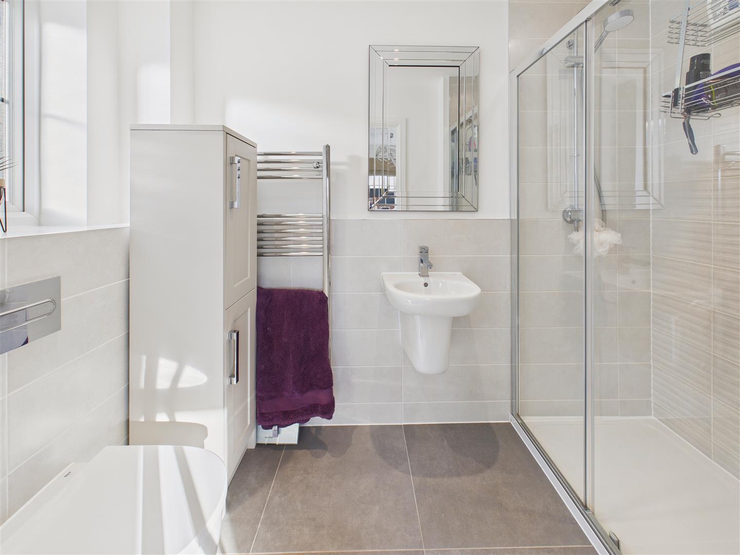 A stylish bathroom with attractive suite comprising bath, shower cubicle with handheld and rainhead shower system, concealed flush W.C., wash hand basin, attractive tiling to walls and floor, heated towel rail.