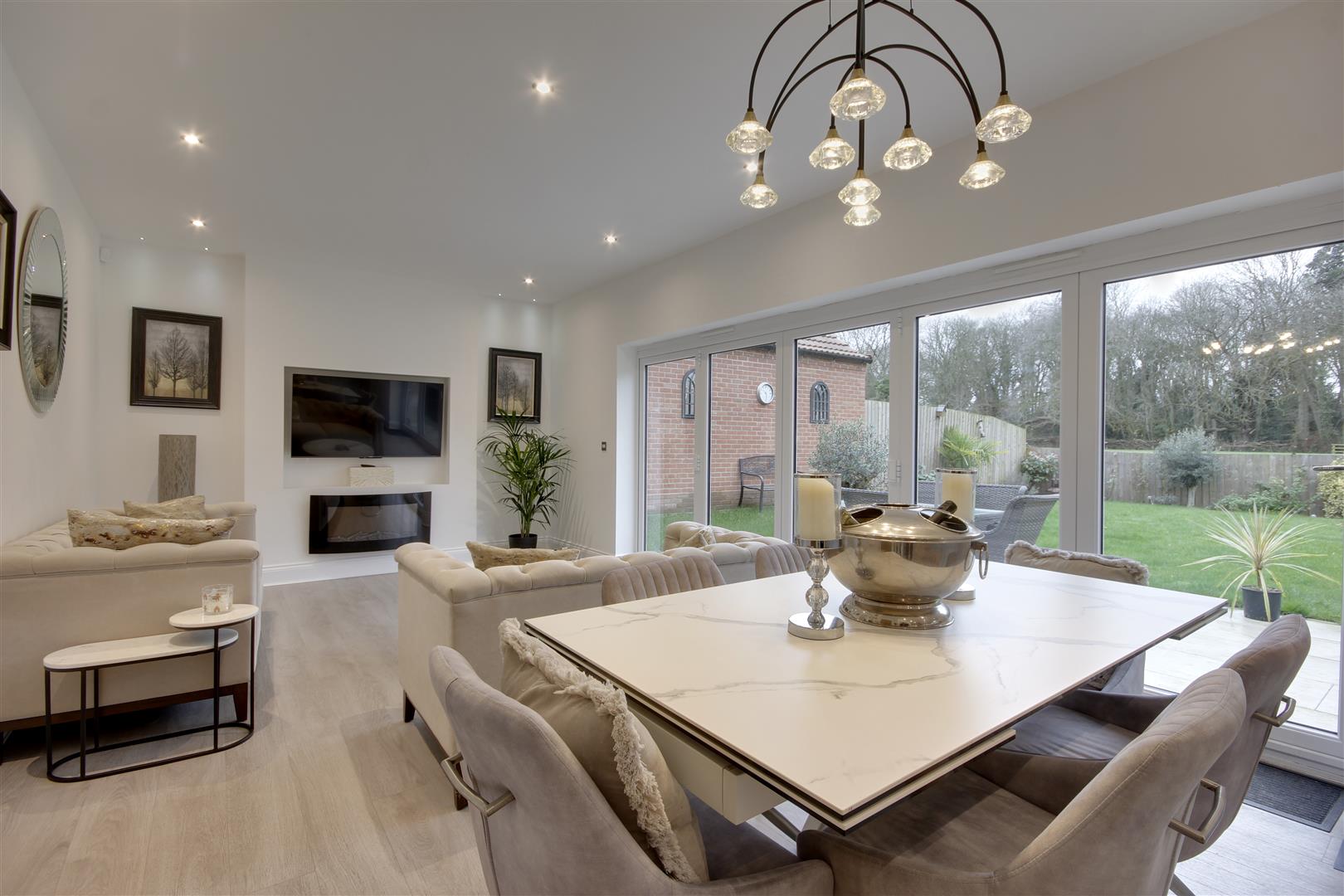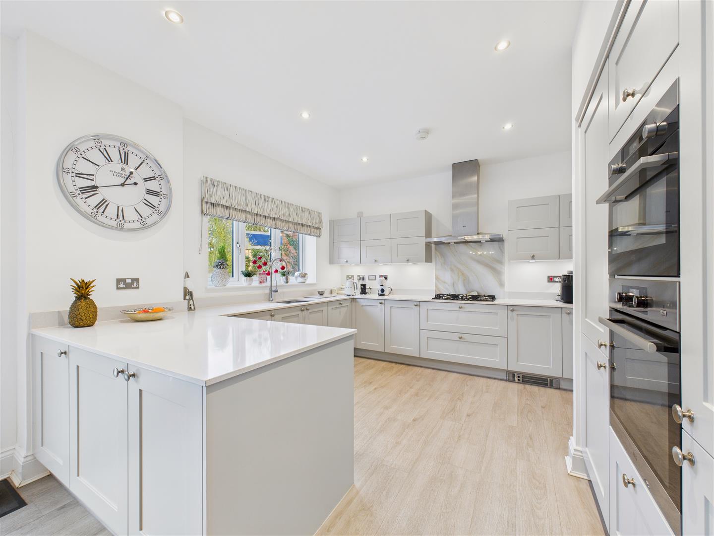 Stretching across the full width of the house, this superb room has a window and bi folding doors out and providing a great view of the garden and open space beyond. The kitchen has a particularly extensive range of stylish fitted units with contemporary quartz work surfaces including an undercounter one and a half sink with professional style mixer tap. Appliances include a twin AEG oven, five ring gas hob with designer extractor hood above, dishwasher and fridge freezer.