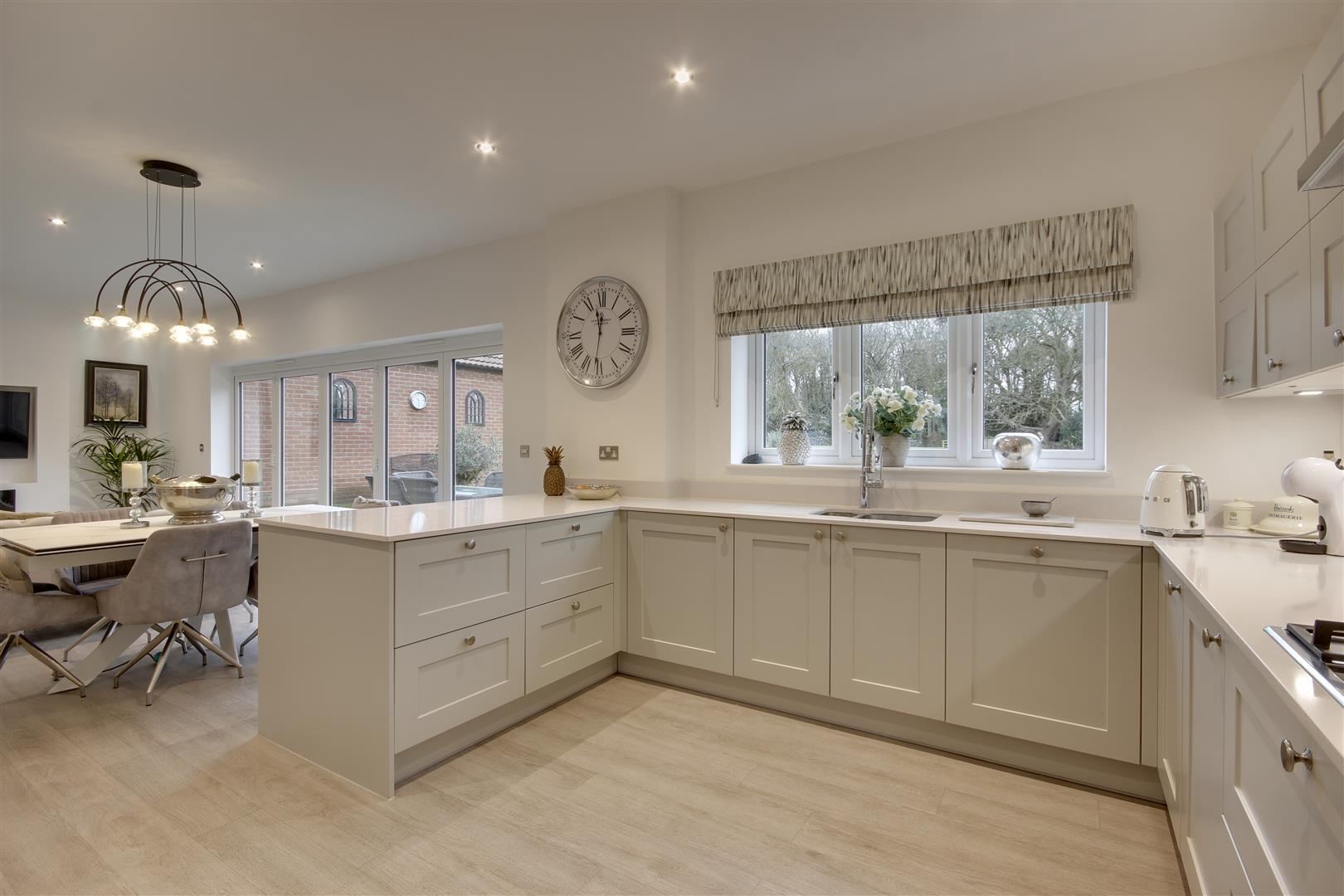 With a matching range of units, again with undercounter sink and professional style mixer tap. Plumbing for an automatic washing machine and space for dryer. Wall mounted gas fired central heating boiler concealed within a cupboard. External access door to side drive.