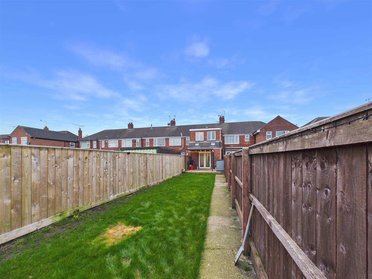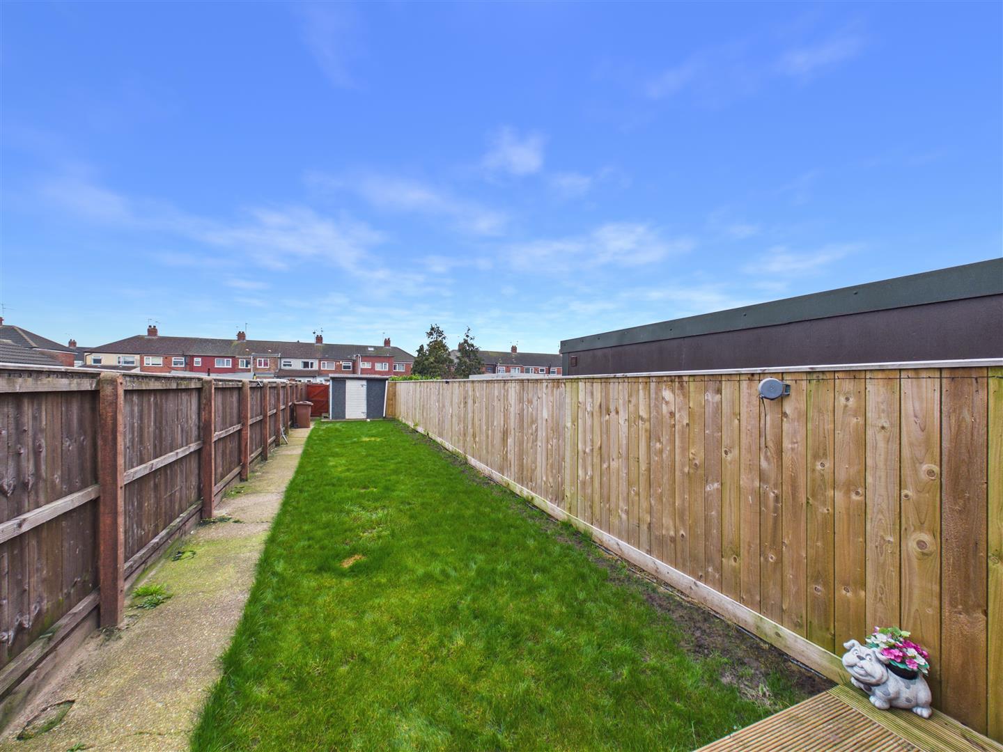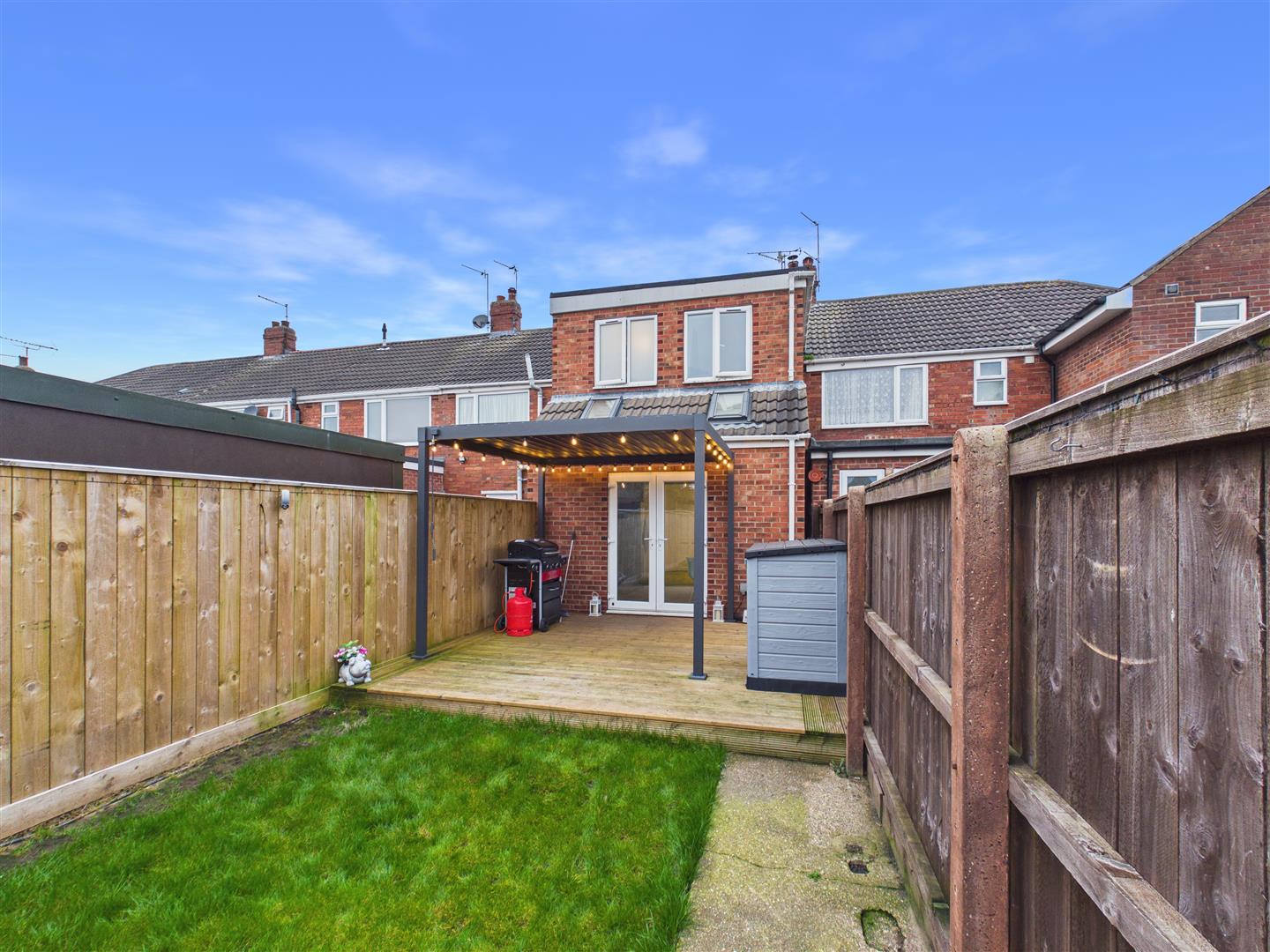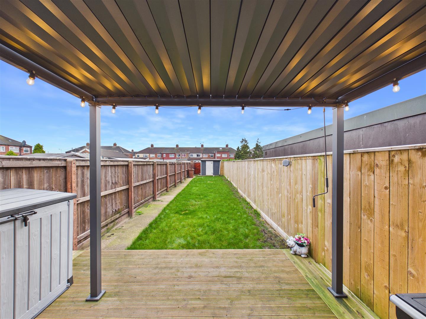 French doors open onto decking at the immediate rear of the property, with a wall-mounted retractable pergola to provide cover from summer sun or rain. This is followed by a lawn with a path to the side, tenfoot access and a garage shed at the far end of the garden. To the front of the property, there is a gravelled drive which provides adequate off-street parking for up to three vehicles.