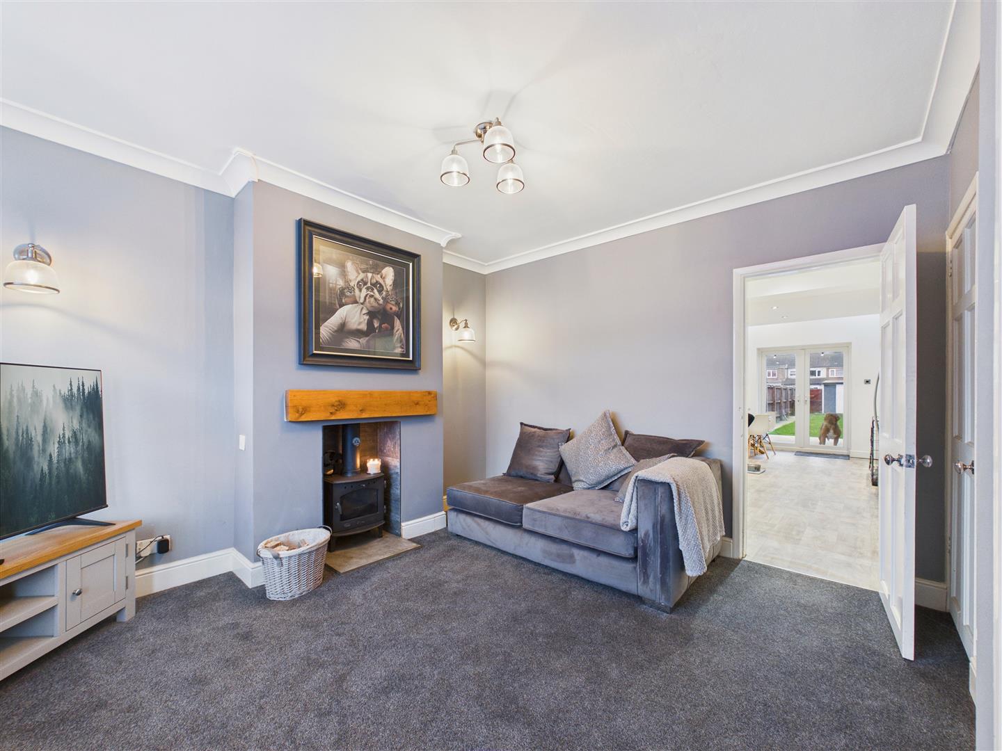 With half bay window to the front, log burner with slate hearth, surround and oak mantle to centre and understairs storage cupboard to corner.