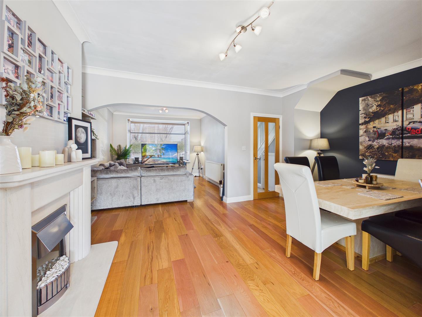 A full width room of generous proportions having a feature stone fire place and surround housing an electric fire. Oak framed double doors open through to the living kitchen and a wide arch way in an open plan style links through to the lounge area.