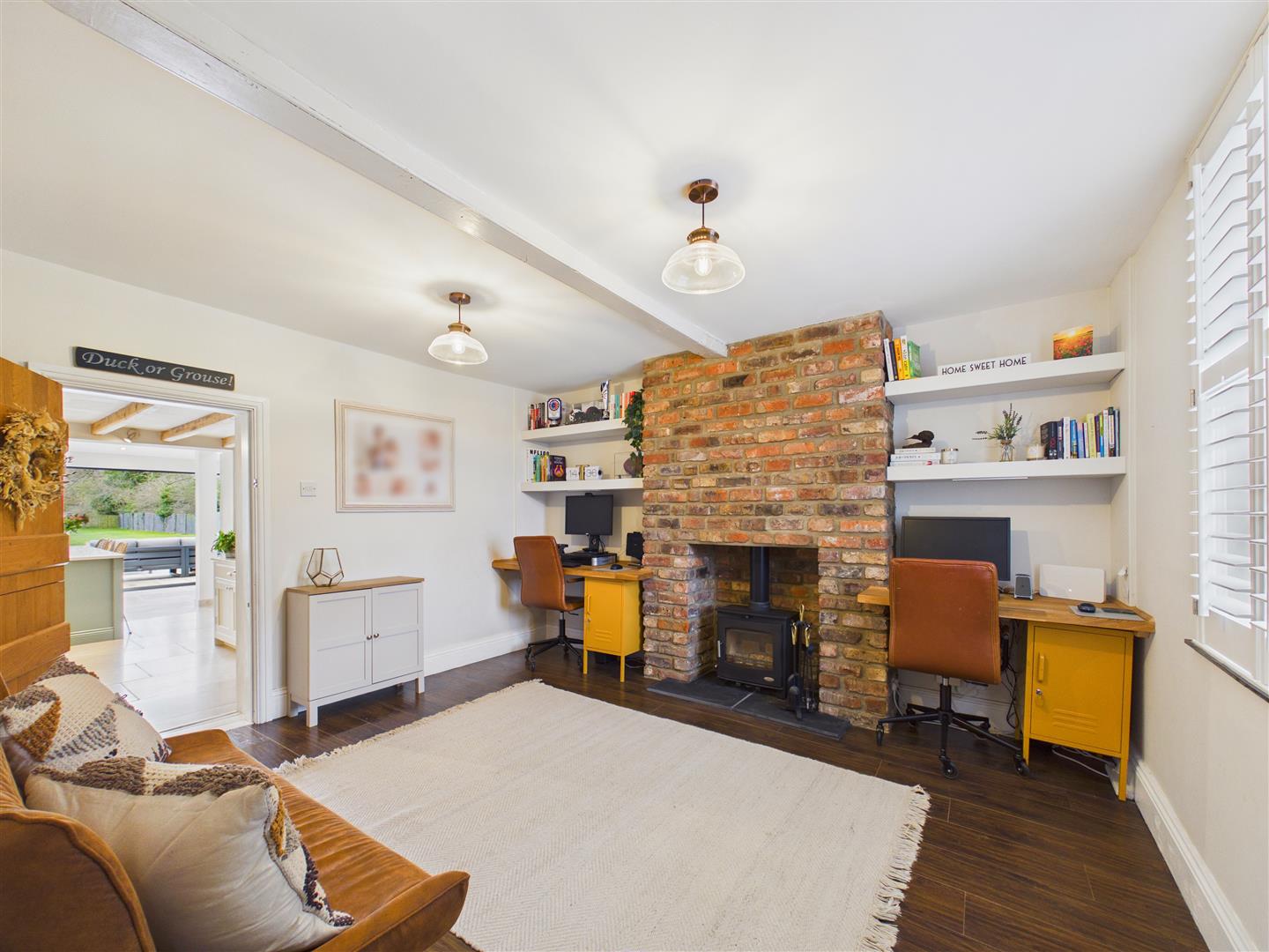 With exposed brick chimney breask housing a log burning stove upon a tiled hearth. Window to the front elevation with plantation shutters.