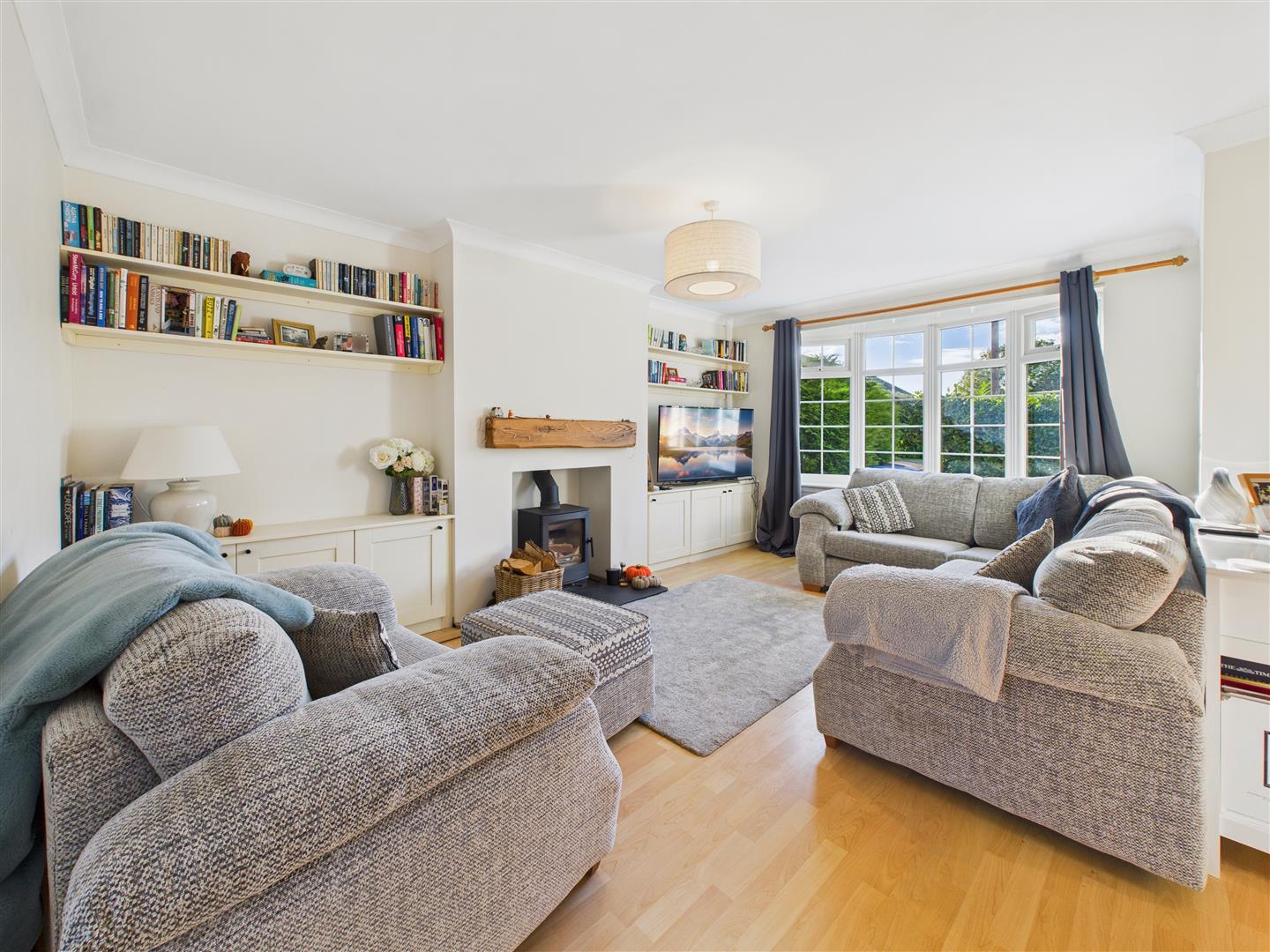 A space suited for a dining table can be found upon entry of this L-shaped room, with lounge space adjacent. There is a bay window to the front and a log burner with stone hearth and fitted oak mantle, and fitted storage cupboard space either side of the chimney breast. Stairs lead to the corner lead to the first floor.