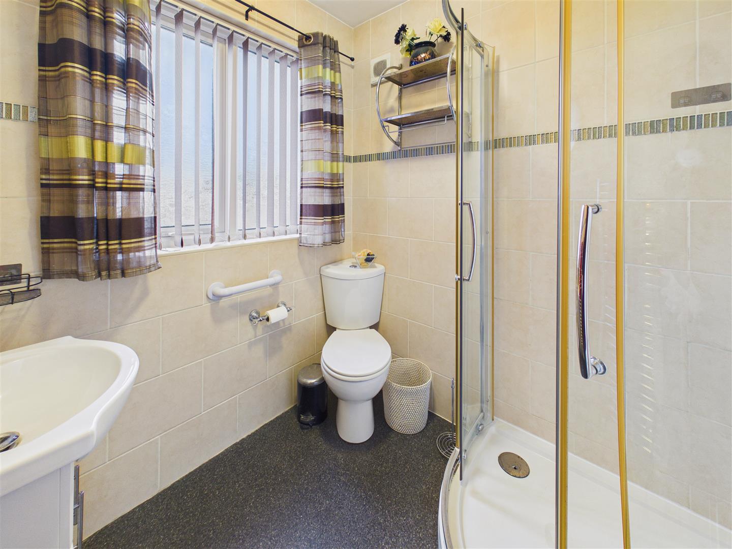 With suite comprising a shower enclosure, vanity unit with wash hand basin and low flush W.C. Tiling to walls, heated towel rail and window to rear.