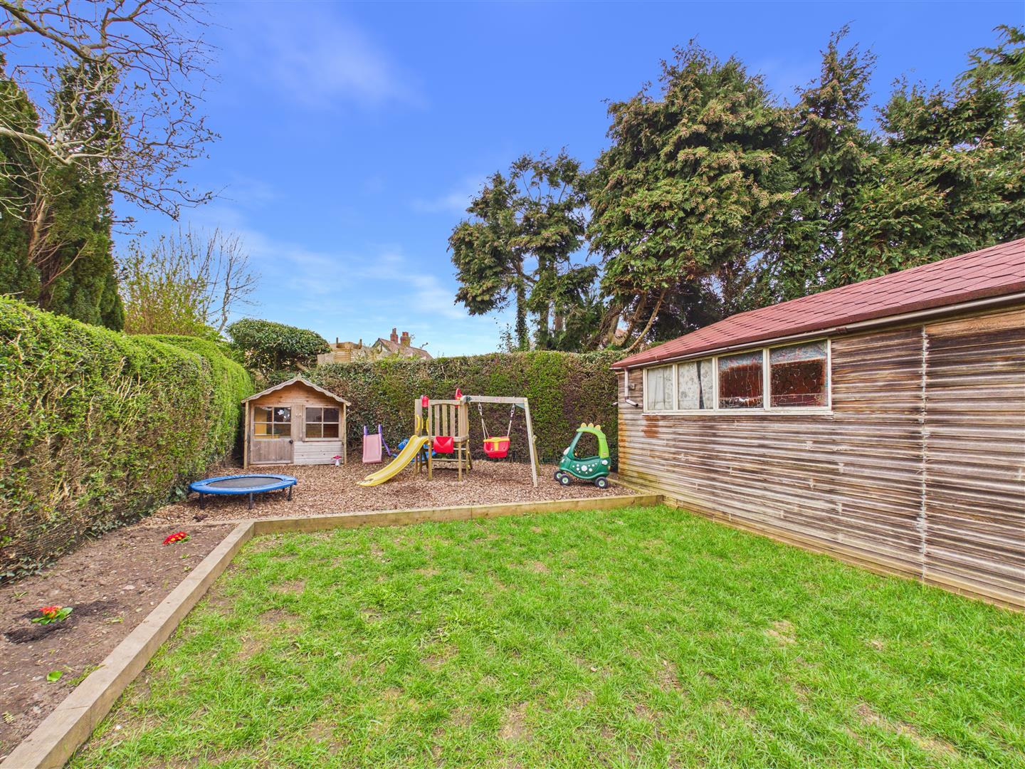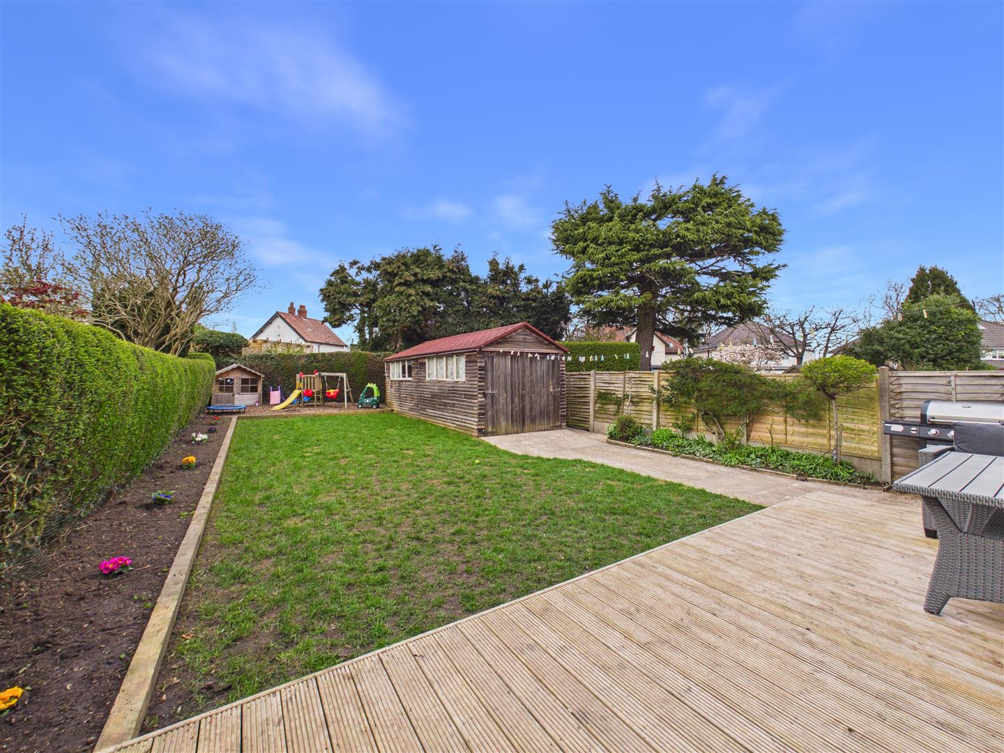 A gravelled driveway provides off-street parking for two vehicles and leads to a single garage. The rear garden is mainly laid to lawn with a decked patio area directly adjoining the house and a woodchip play area to the rear. The property also benefits from a large detached garage which includes a workshop area.