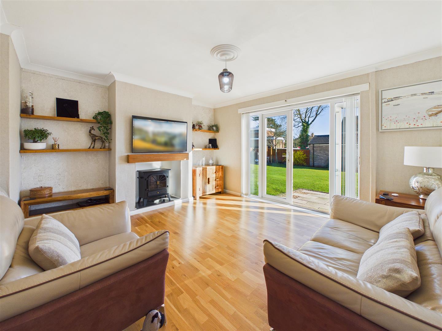 With wall mounted TV point with oak mantle below and space for an electric stove. French doors with windows to the side open out onto the rear patio.