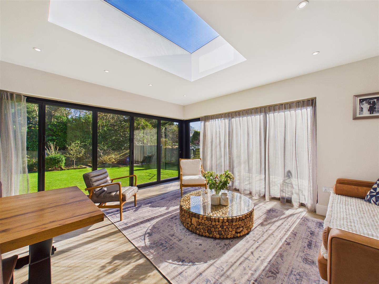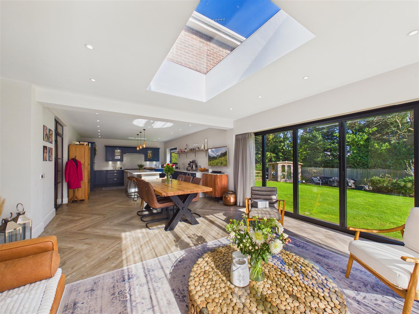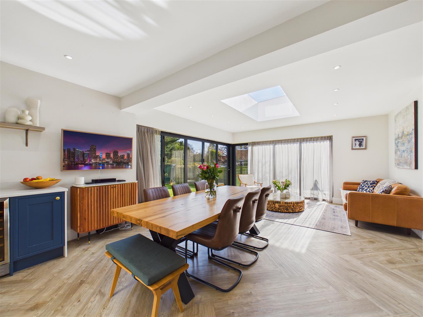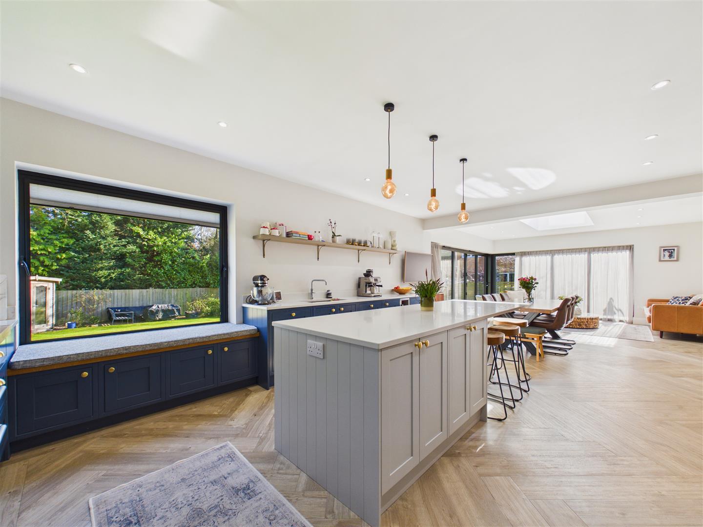 This stunning space situated to the rear of the property with two sets of bi-folding doors opening out to the rear garden. The kitchen is fitted with a range of shaker style units with Silestone worktops and a large central island with breakfast bar peninsular. Appliances include a Rangemaster cooker with filter above, microvwave, larder fridge ad freezer, two dishwashers and a wine chiller. Inset spot lights, Amtico flooring with underfloor heating.